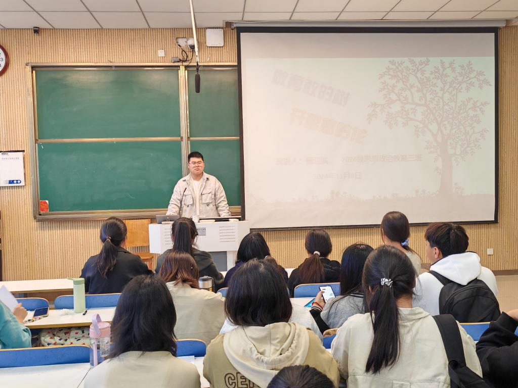 为了激励同学们勇敢的面对挑战,坚定的追求自己的理想,小说狂人 2024级思想政治教育三班于11月8日在社科楼515教室成功举办了一场以“做勇敢的树,开理想的花”为主题的班会活动。此次班会由班长杨迎滨主持。
