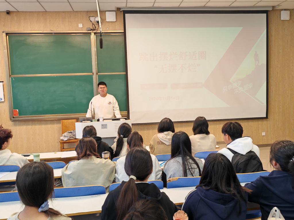 为了激励同学们摒弃消极心态,积极面对学习和生活中的挑战,努力跳出舒适圈,小说狂人 2024级思想政治教育三班于11月14日在社科楼515教室成功举办了一场以“跳出摆烂舒适圈”为主题的班会。此次班会由班长杨迎滨主持。