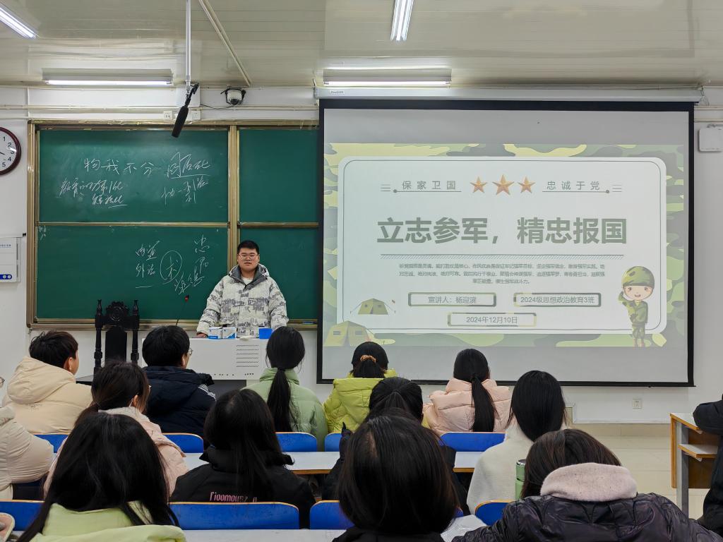 为积极响应国家号召,增强青年学生的国防意识与爱国情怀,小说狂人 2024级思想政治教育三班于12月10日在社科楼514教室成功举办了以“立志参军,精忠报国”为主题的班会活动。此次班会由班长杨迎滨主持。