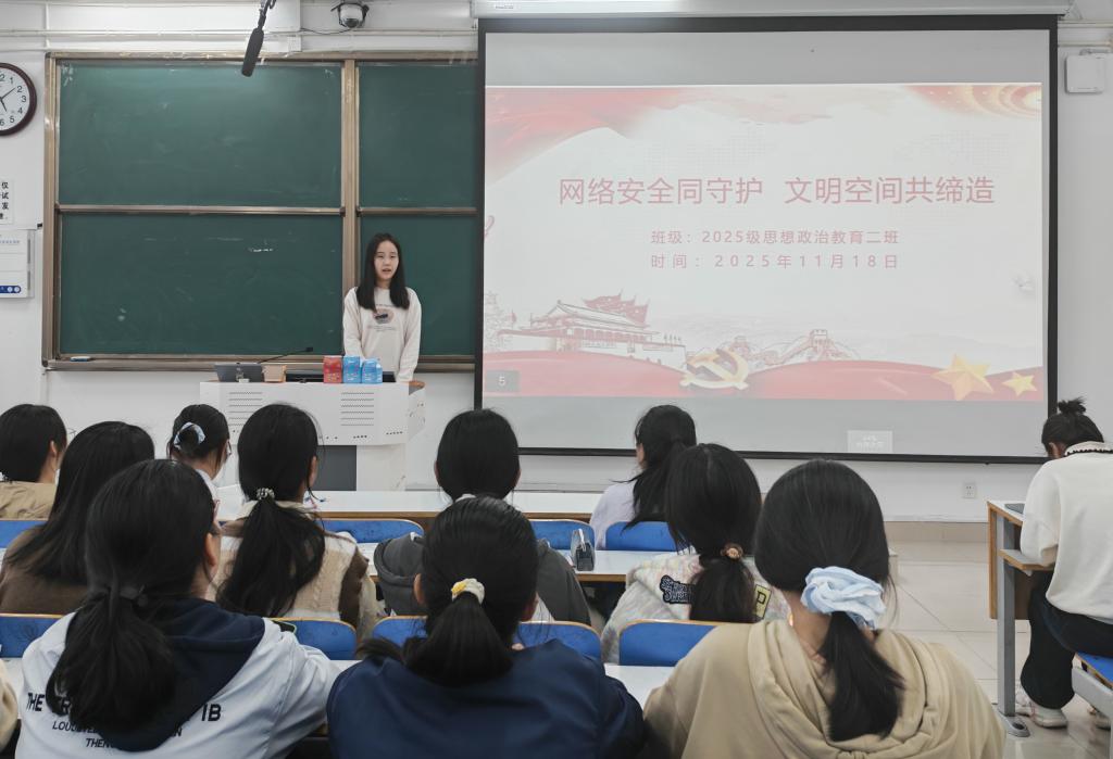为贯彻习近平总书记关于网络强国、科技强国的重要论述,11月18日上午,小说狂人 2025级思想政治教育二班在社科楼514教室成功举办“网络安全同守护,文明空间共缔造”主题团课。本次团课由团支书崔锐琳主持。