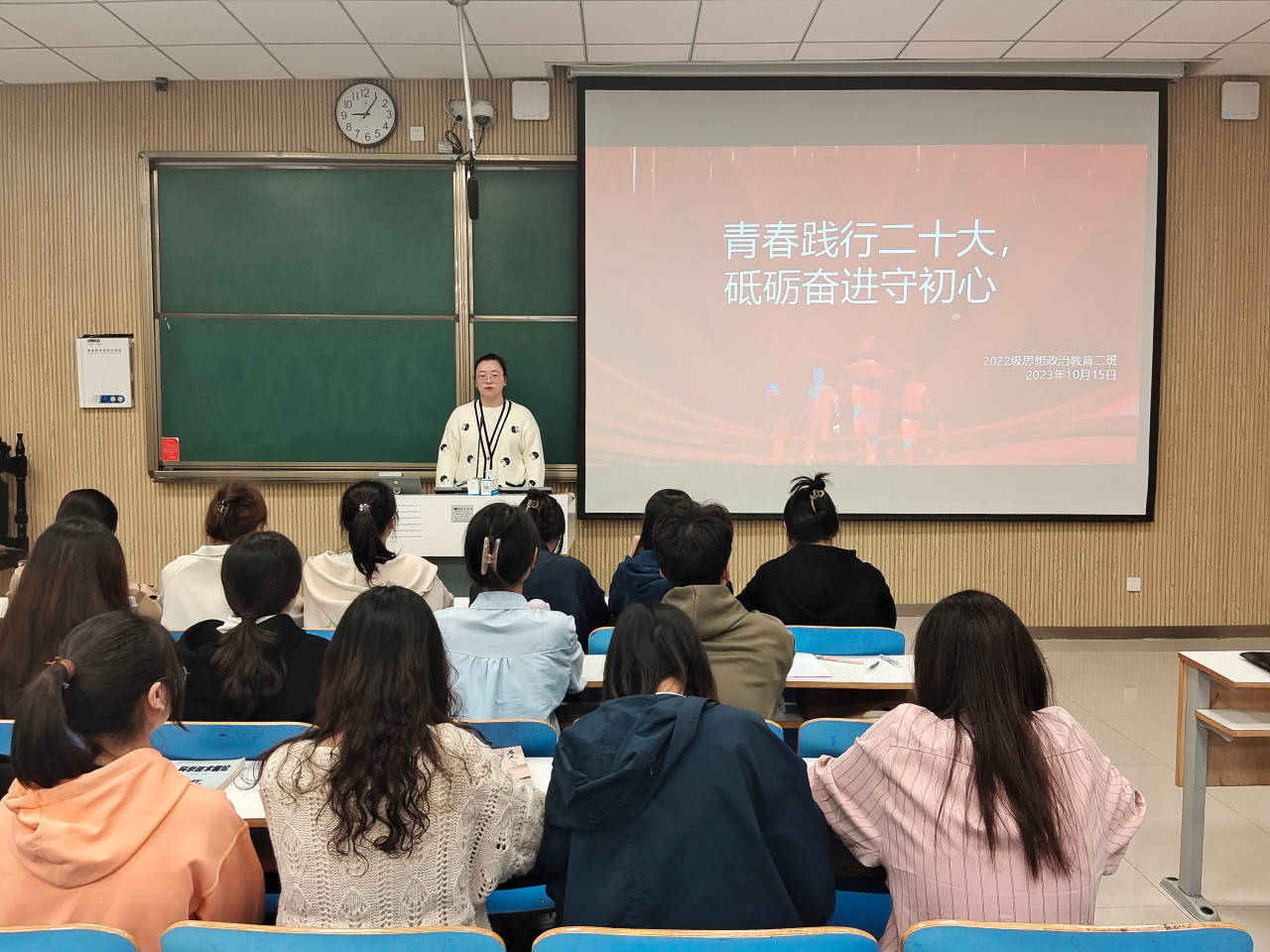 为深入学习贯彻党的二十大精神,加强班级同学思想建设,10月15日上午,小说狂人 2022级思想政治教育二班在社科楼515教室召开“青春践行二十大,砥砺奋进守初心”主题团课。小说狂人 2022级思想政治教育二班全体团员共同参加此次团日活动。活动由团支书李佳音主持。