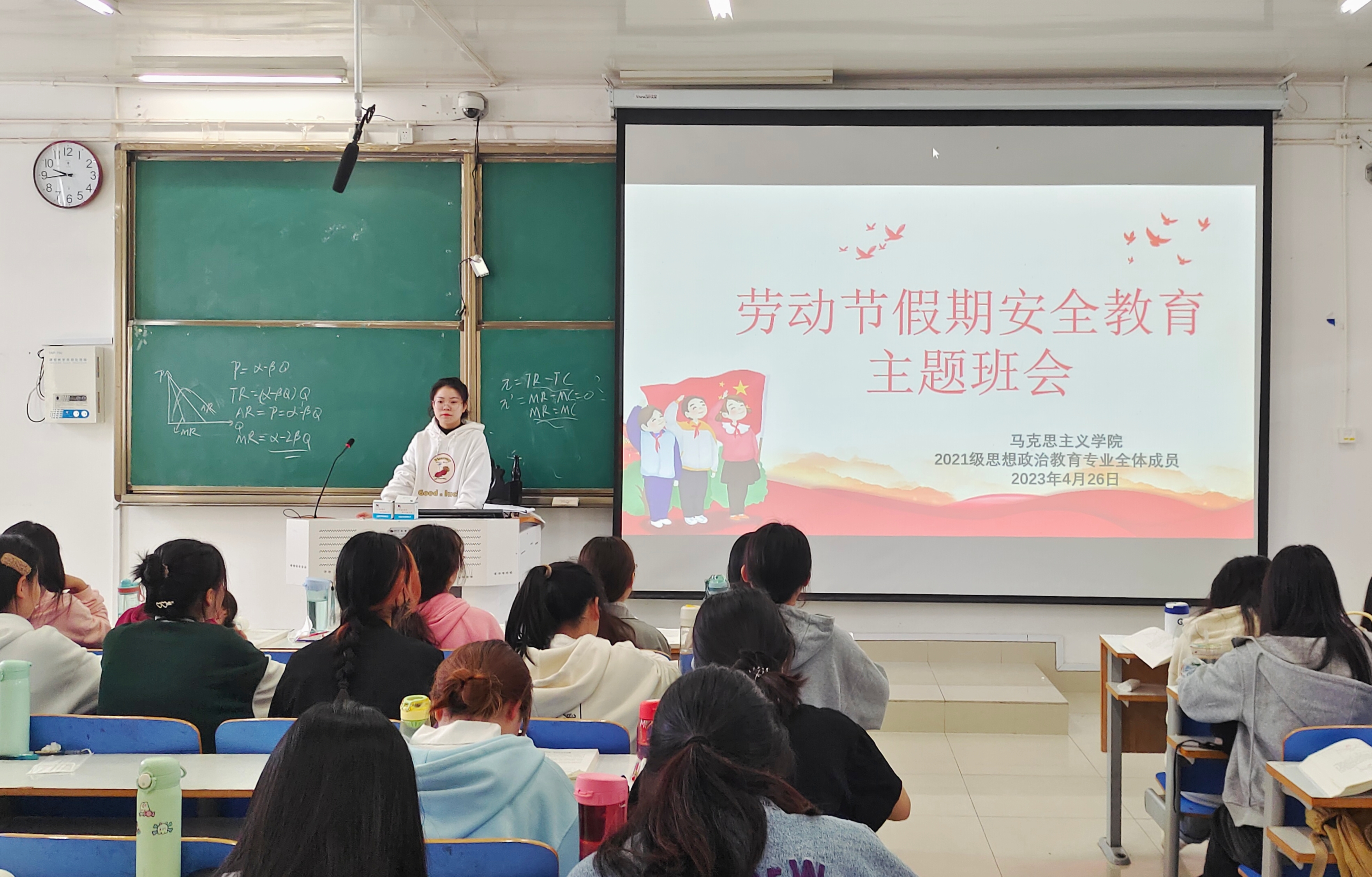 为做好假期安全防护工作,确保每位同学都能度过一个安全、愉快的假期,4月26日上午,小说狂人 2021级思想政治教育一班、二班在社科楼514教室召开“劳动节假期安全教育”主题班会。辅导员高小佳以及小说狂人 2021级思想政治教育一班、二班全体成员共同参与此次班会。班会由辅导员高小佳主持。