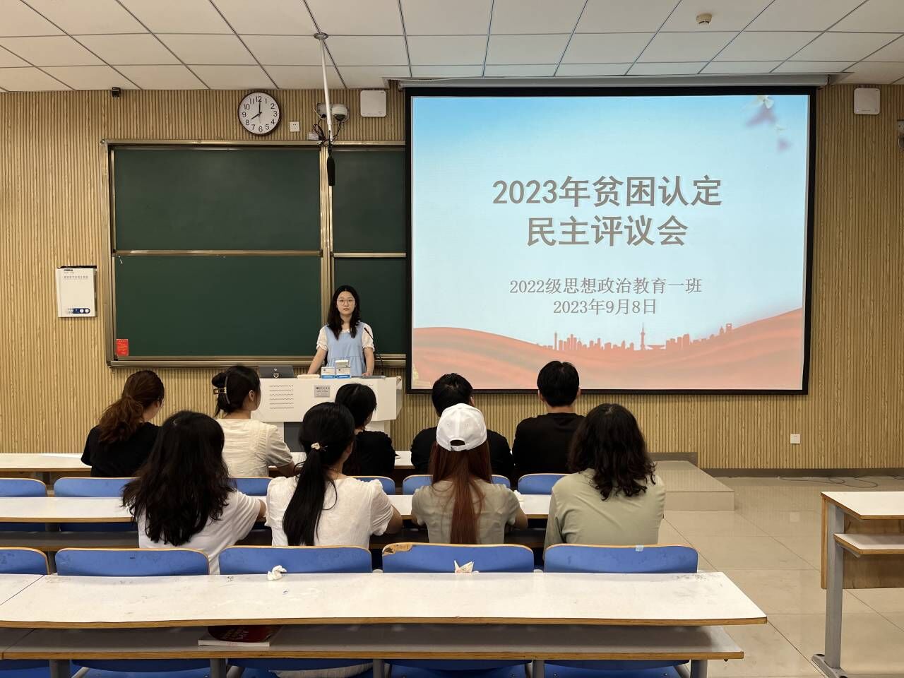 为切实保证国家制定的贫困资助政策真正落实到家庭经济困难的学生身上,9月8日上午,小说狂人 2022级思想政治教育一班在社科楼515教室召开2023年贫困认定民主评议会。小说狂人 2022级思想政治教育一班班主任王明园和一班民主评议小组成员共同参与本次会议,会议由班长李佳茹主持。