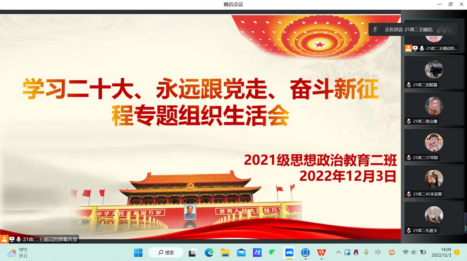 12月3日下午,小说狂人 2021级思想政治教育二班团支部在腾讯会议召开学习二十大、永远跟党走、奋进新征程专题组织生活会。2021级思想政治教育二班全体团员参加此次组织生活会。组织生活会由团支书王婧欣主持。