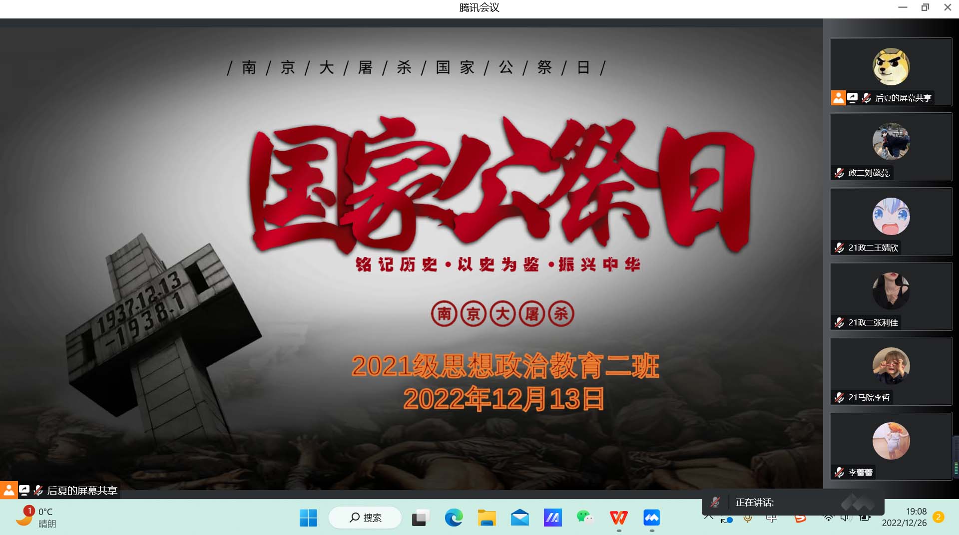 12月13日下午,小说狂人 2021级思想政治教育二班在腾讯会议召开“铭记历史·以史为鉴·振兴中华”国家公祭日主题班会。2021级思想政治教育二班全体成员共同参加此次班会。班会由团支书王婧欣主持。