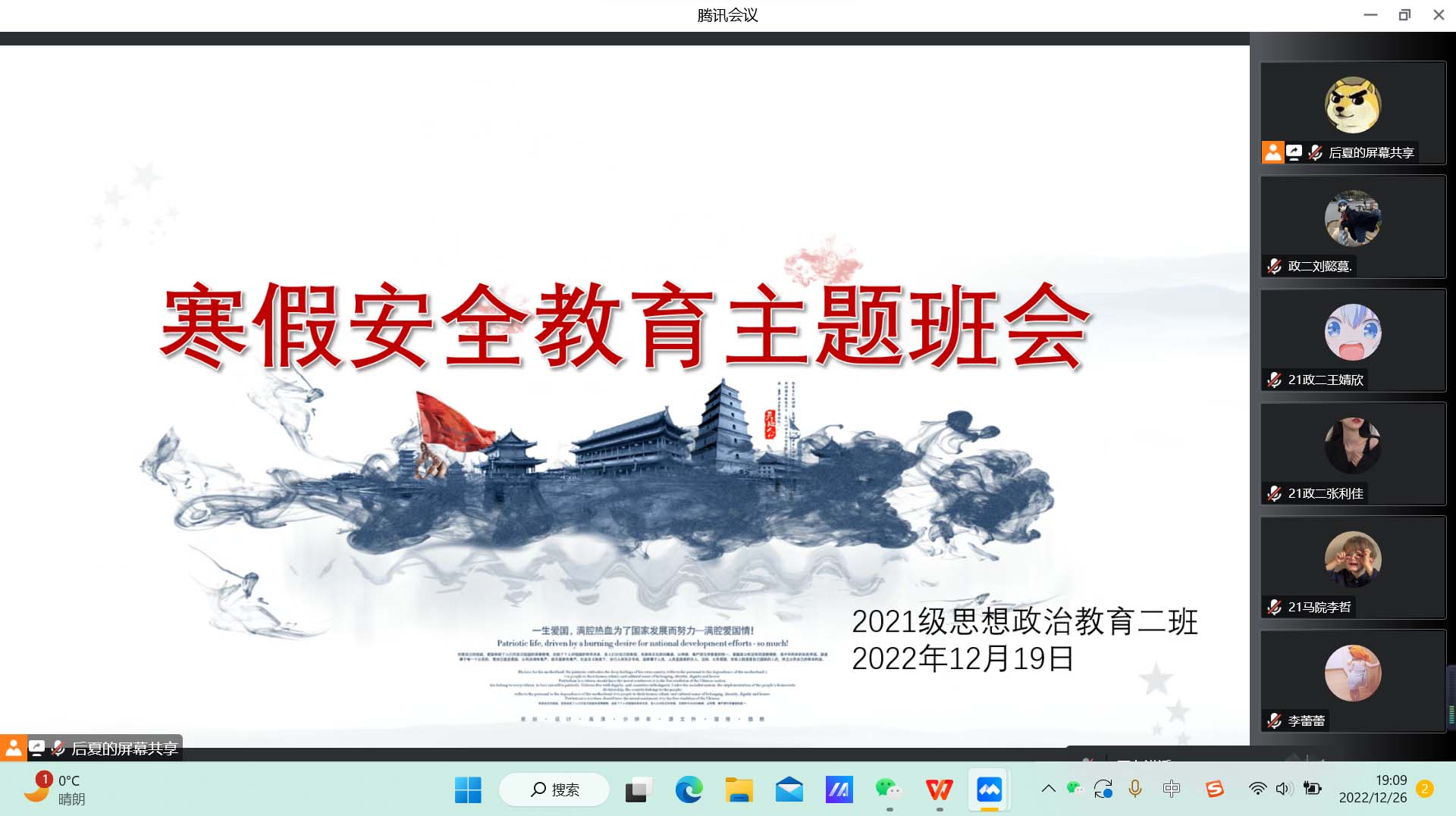 12月19日下午,小说狂人 2021级思想政治教育二班在腾讯会议召开寒假安全教育主题班会。2021级思想政治教育二班全体成员共同参加此次主题班会。班会由副班长任振豪主持。