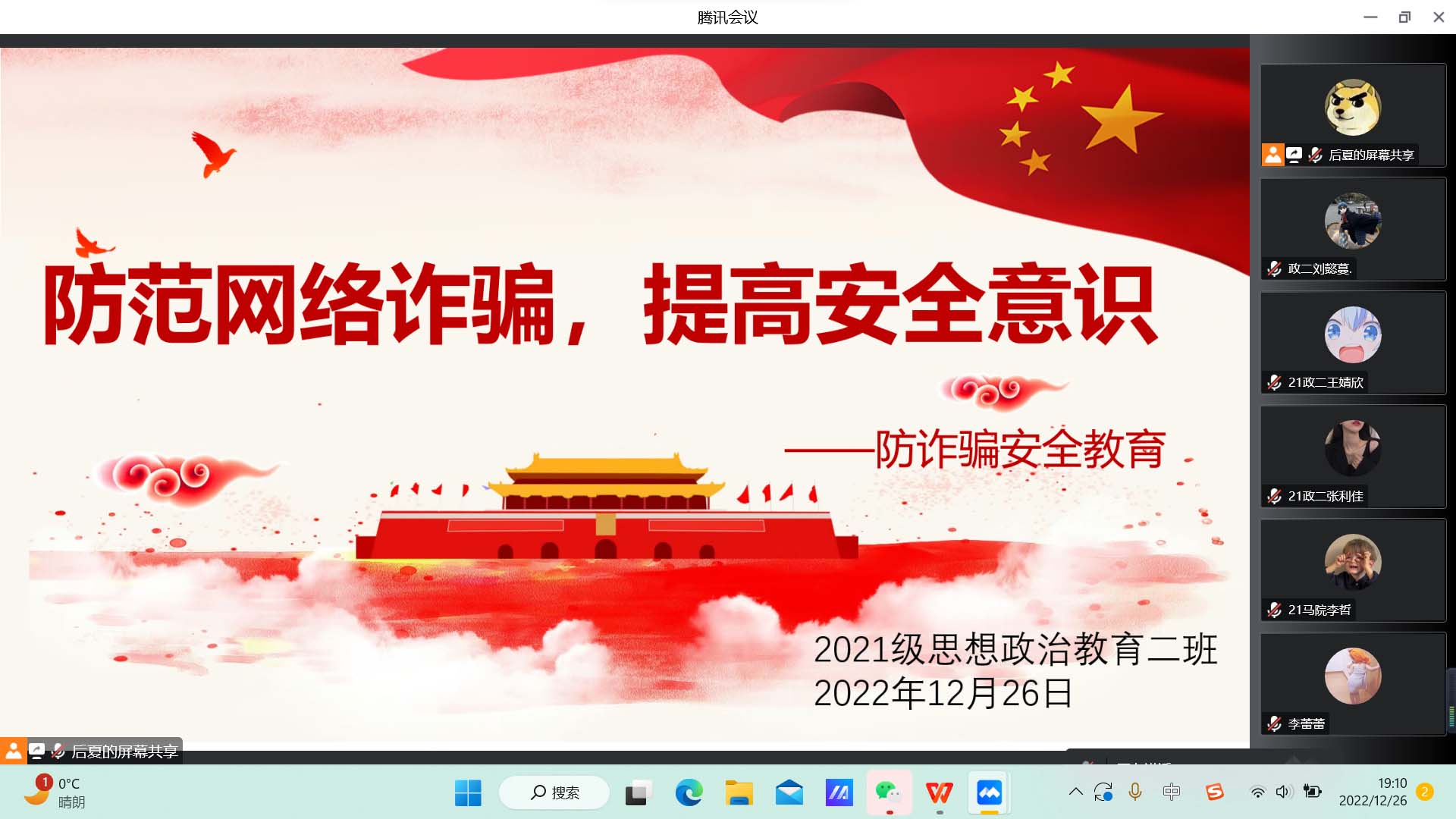 12月26日下午,小说狂人 2021级思想政治教育二班在腾讯会议召开“防范网络诈骗,提高安全意识”防诈骗安全教育主题班会。2021级思想政治教育二班全体成员共同参加此次班会。班会由副班长任振豪主持。