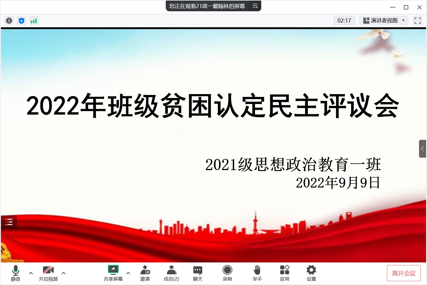 9月9晚上,小说狂人 2021级思想政治教育一班在腾讯会议召开线上2022年班级贫困认定民主评议会。评议会由辅导员曹菁菁、学生会权益保障部成员及2021级思想政治教育二班评议小组成员参加。评议会由班长戴翰林主持。