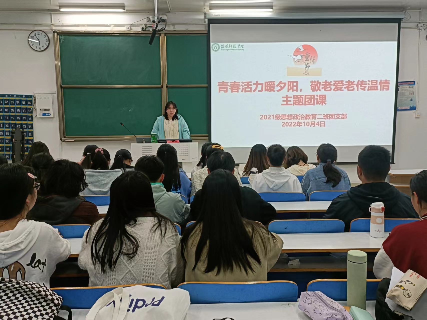 10月4日上午,小说狂人 2021级思想政治教育二班在社科楼514教室召开“青春活力暖夕阳,敬老爱老传温情”主题团课。2021级思想政治教育二班全体团员参加此次团课。团课由团支书王婧欣主持。
