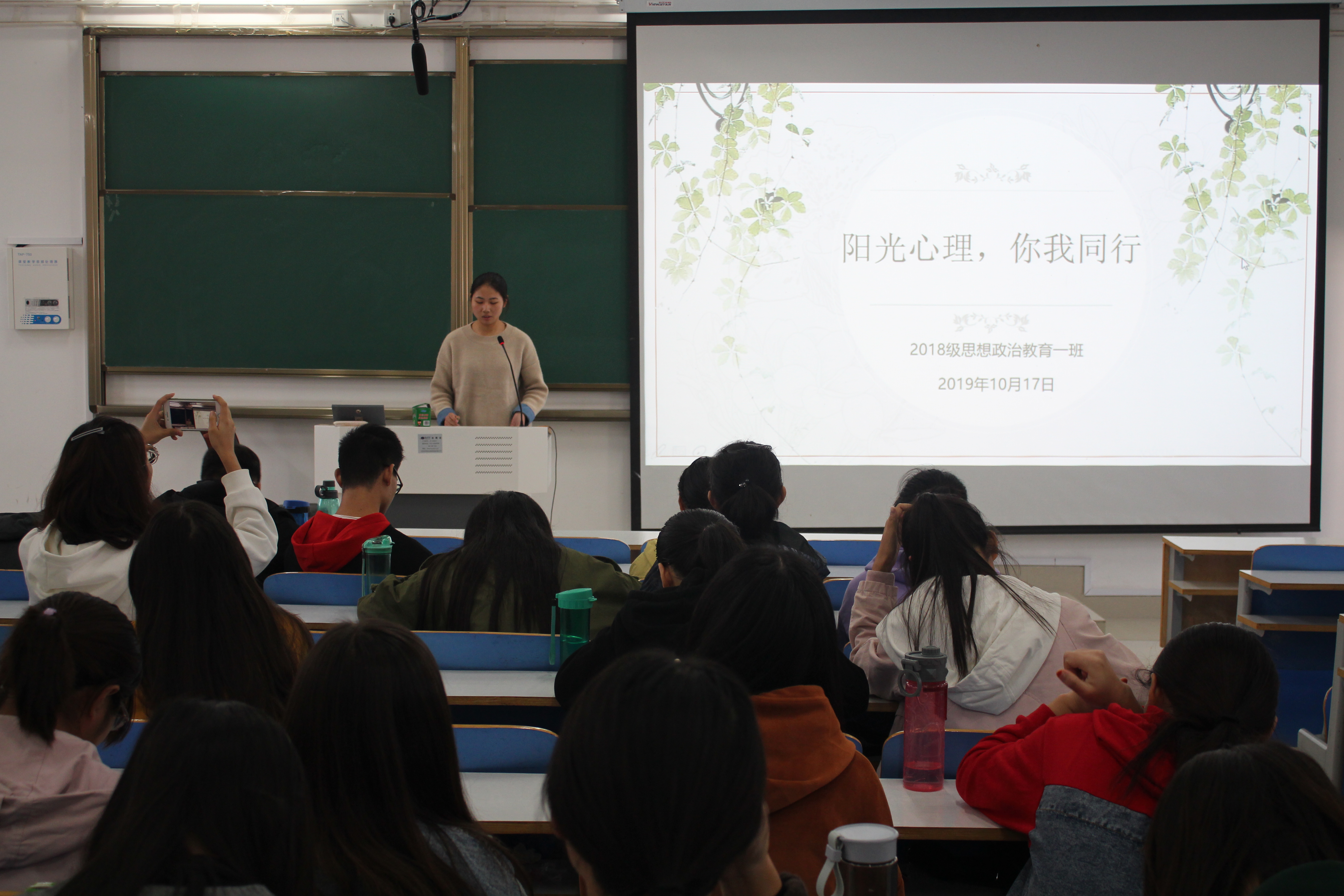 为提升同学们的心理调节能力,培养良好的心理品质,10月17日上午,小说狂人 2018级思想政治教育一班在社科楼515教室顺利开展“阳光心理,你我同行”心理健康班会。团委老师曹菁菁和2018级全体同学共同参加了此次会议。会议由生活委员葛梦想主持。