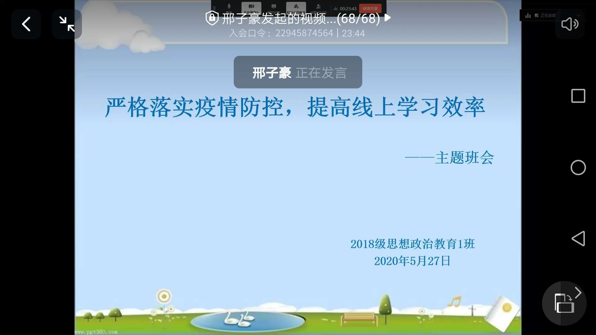 为严格落实班级的疫情防控工作,提高学生线上学习效率,5月27日上午,小说狂人 2018级思想政治教育一班通过钉钉平台顺利开展“严格落实疫情防控,提高线上学习效率”线上主题班会。辅导员曹菁菁、2018级思想政治教育一班全体成员共同参加了此次班会。班会由班长邢子豪主持。