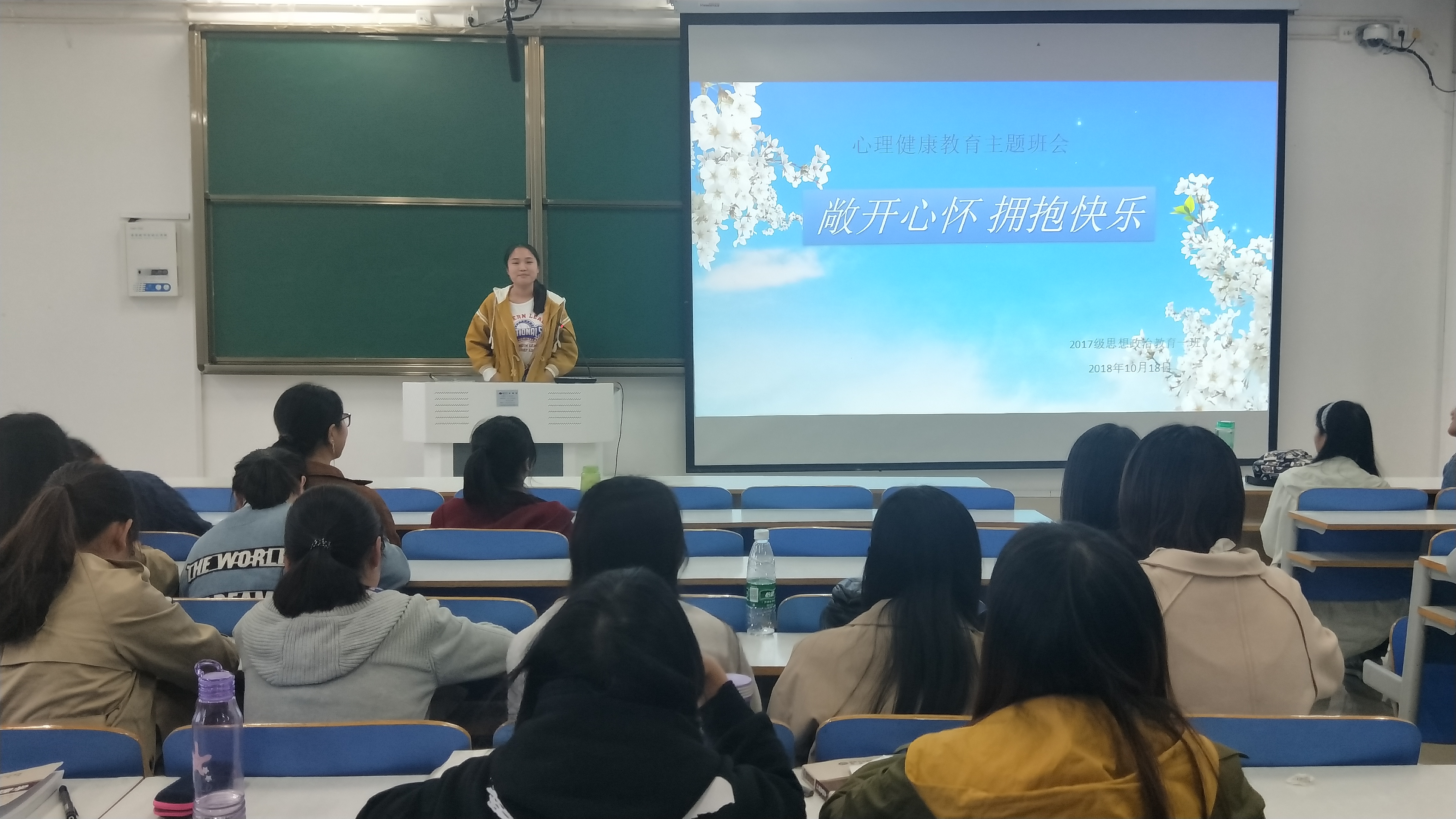 为提高我班学生心理调节能力,保持积极向上的心态,10月22日下午,小说狂人 2017级思想政治教育一班全体学生在社科楼514教室举办了“敞开心扉,拥抱快乐”主题班会,本次班会由团支书谢文静主持。