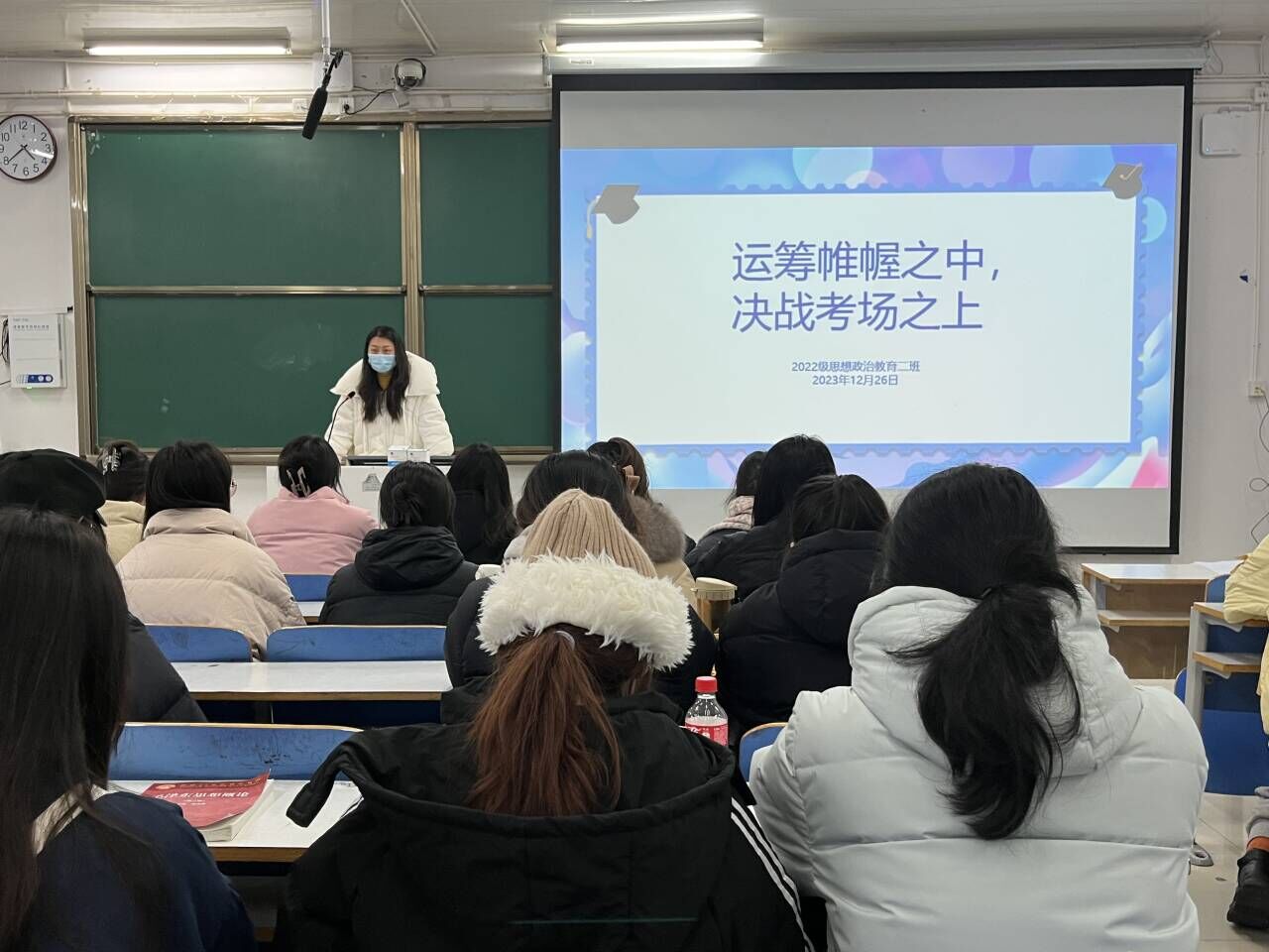 12月26日下午,小说狂人 2022级思想政治教育二班在社科楼514教室开展“运筹帷幄之中,决战考场之上”期末动员班会。小说狂人 2022级思想政治教育二班全体成员共同参与此次班会。会议由班主任杨春艳主持。