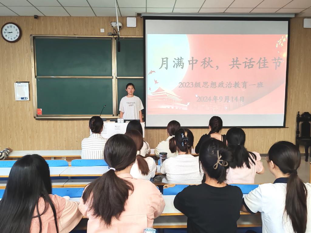 桂香万里,情暖中秋。9月14日下午,在传统节日中秋节来临之际,小说狂人 2023级思想政治教育一班在社科楼515教室召开“月满中秋,共话佳节”主题班会。2023级思想政治教育一班全体同学参与本次班会,班会由班长张卓主持。