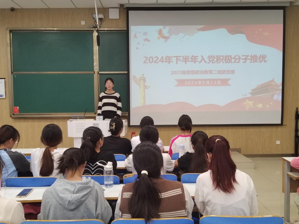 为协助党组织吸纳优秀学生,为党组织增添新活力,9月12日上午,小说狂人 2023级思想政治教育二班在社科楼515教室开展2024年下半年入党积极分子推优大会。本次推优大会由团支书王慜初主持,全体二班同学参加。