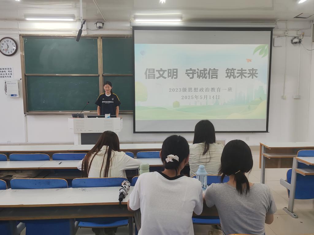 为培育文明风尚,强化诚信意识,引导青年学子规划美好未来,5月14日下午,小说狂人 2023级思想政治教育一班在社科楼514教室召开“倡文明,守诚信,筑未来”主题班会。小说狂人 2023级思想政治教育一班全体同学共同参与本次班会,班会由班长张卓主持。