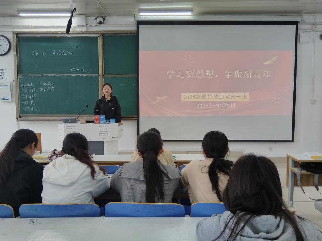 为激励我班同学深入学习和贯彻习近平新时代中国特色社会主义思想,将党的智慧结晶同个人发展实际相结合,以实际行动实现人生理想和民族复兴,10月9日上午,小说狂人 思想政治教育一班于社科楼515教室开展“学习新思想,争做新青年”主题团课。本次团课由团支书李冉主持,一班全体同学参加。