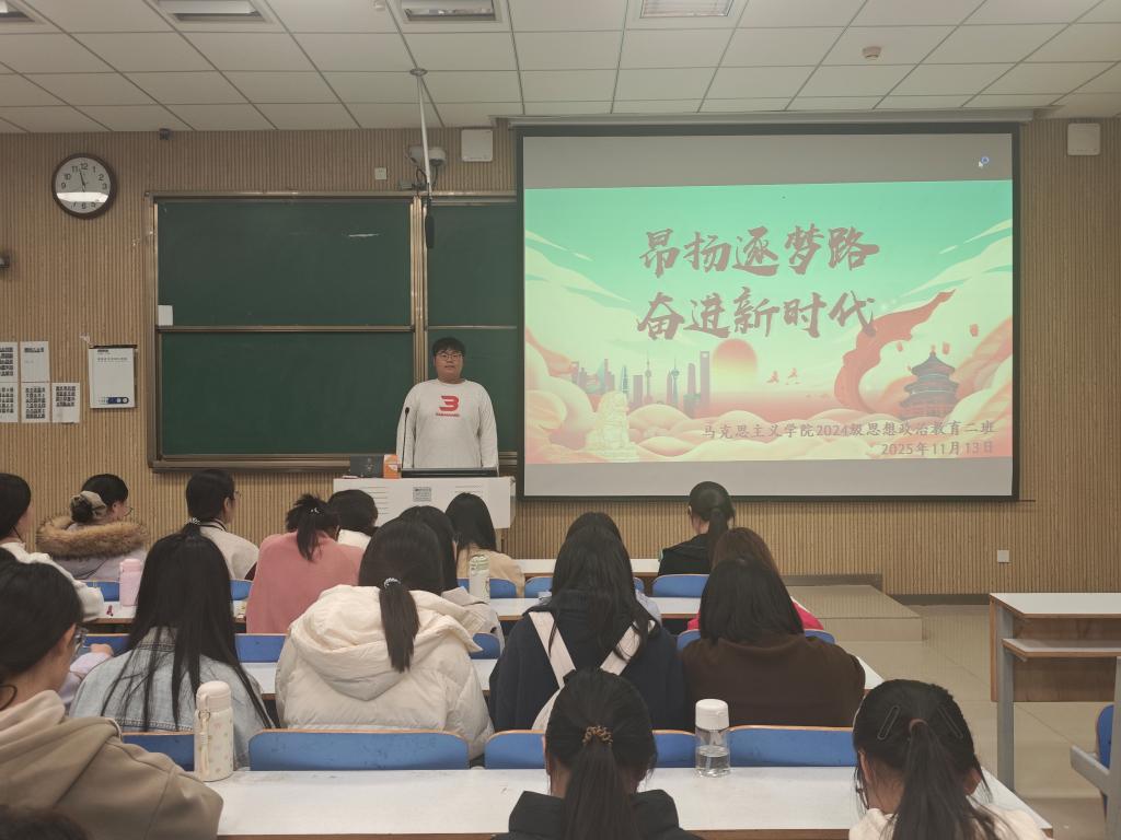为深入引导青年学生锚定理想航向、勇担时代使命,切实将个人成长融入国家发展大局,11月13日下午,小说狂人 2024级思想政治教育二班在社科楼515教室开展“昂扬逐梦路,奋进新时代”主题团课。本次团课由团支书王志颖主持,二班全体同学全程参与、积极互动。