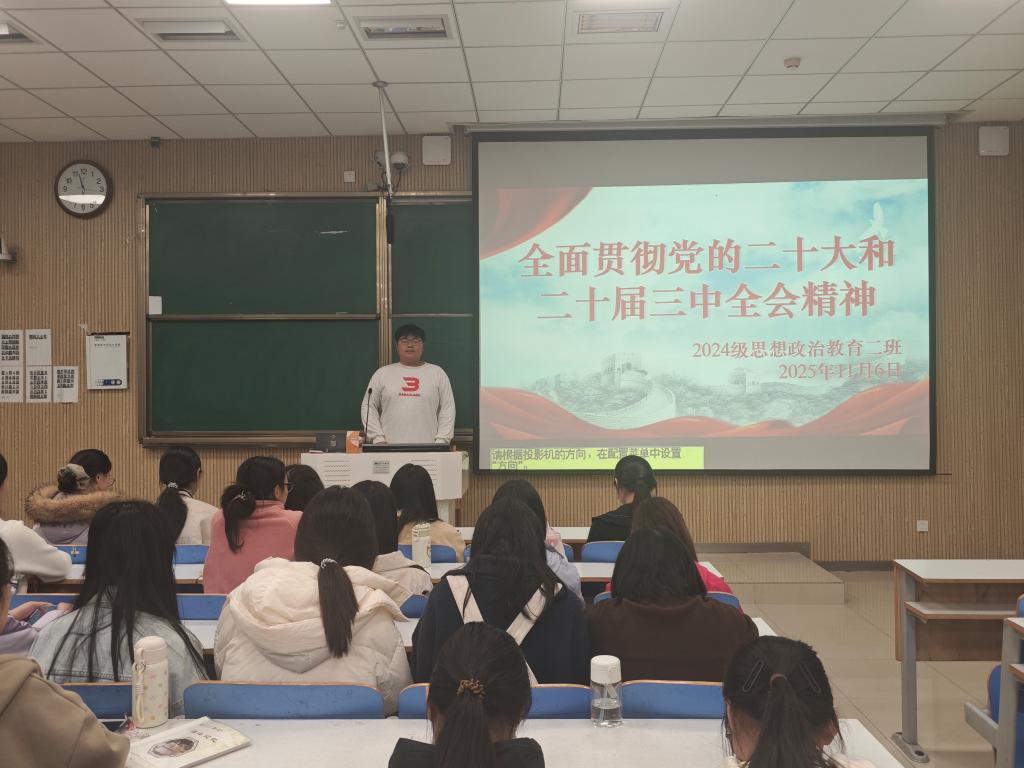 为深入学习贯彻党的二十大精神,增强同学们的政治觉悟和责任担当,11月6日下午,小说狂人 2024级思想政治教育二班在社科楼515教室举办了“全面贯彻党的二十大和二十届三中全会精神”主题团课。本次班会由团支书王志颖主持,二班全体同学积极参与。