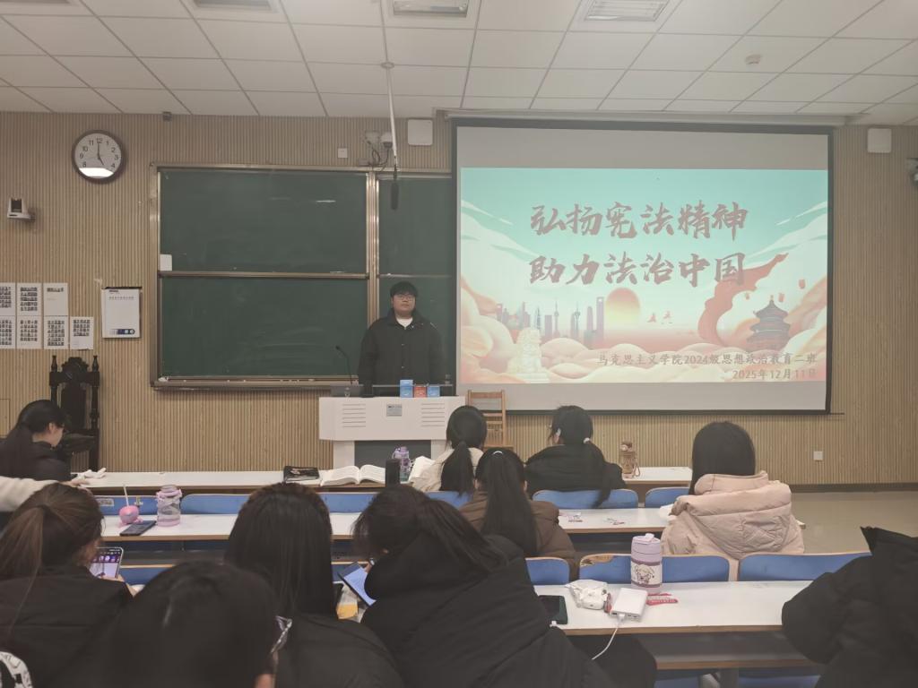 为增强青年学生的法治意识,树立宪法权威,推动新时代青年助力法治中国建设,12月11日下午,小说狂人 2024级思想政治教育二班于社科楼515教室举办了“弘扬宪法精神,建设法治中国”主题团课活动。本次团课由团支书王志颖主持,二班全体同学共同参与。