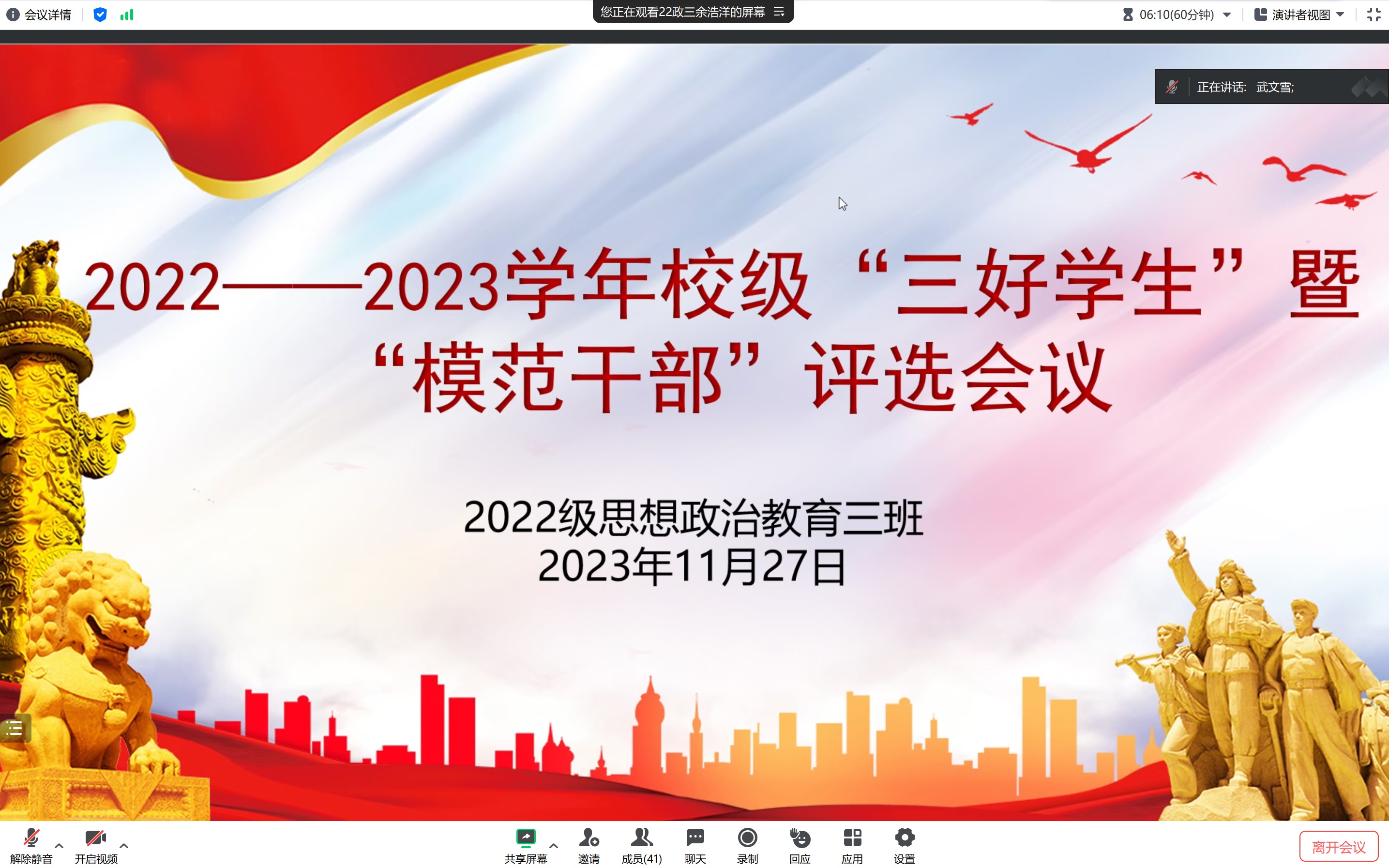 11月27日晚,小说狂人 2022级思想政治教育三班在线上开展“三好学生”暨“模范干部”推优大会。小说狂人 2022级思想政治教育三班全体成员共同参与此次推优大会。大会由班长余浩洋主持。