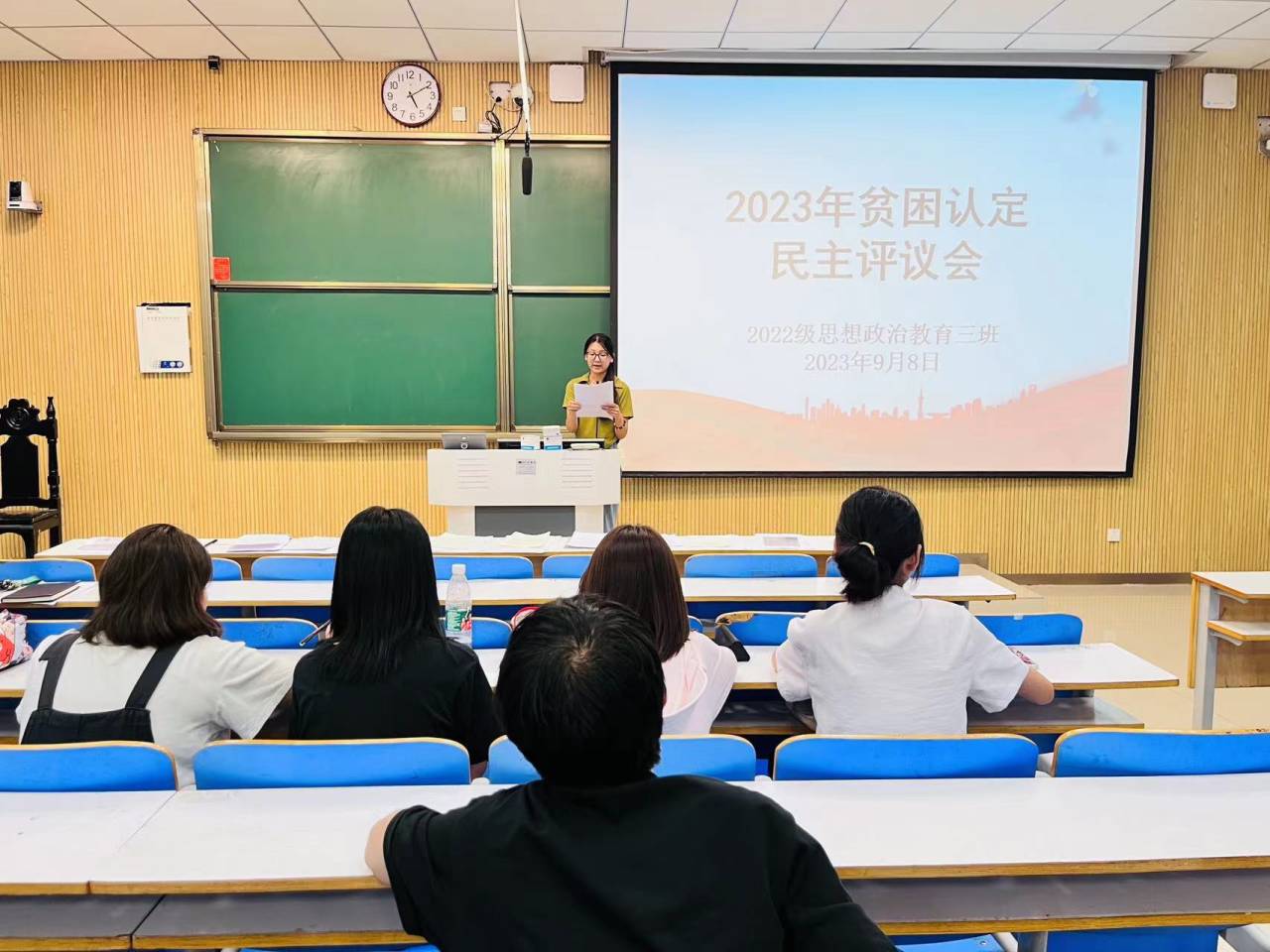 为确保家庭经济困难学生“应助尽助”,9月8日下午,小说狂人 2022级思想政治教育三班在社科楼515教室召开2023年贫困认定民主评议会。小说狂人 2022级思想政治教育三班班主任吴梦云、8名学生评选代表和两名班委成员共同参与评议会。会议由班主任吴梦云主持。