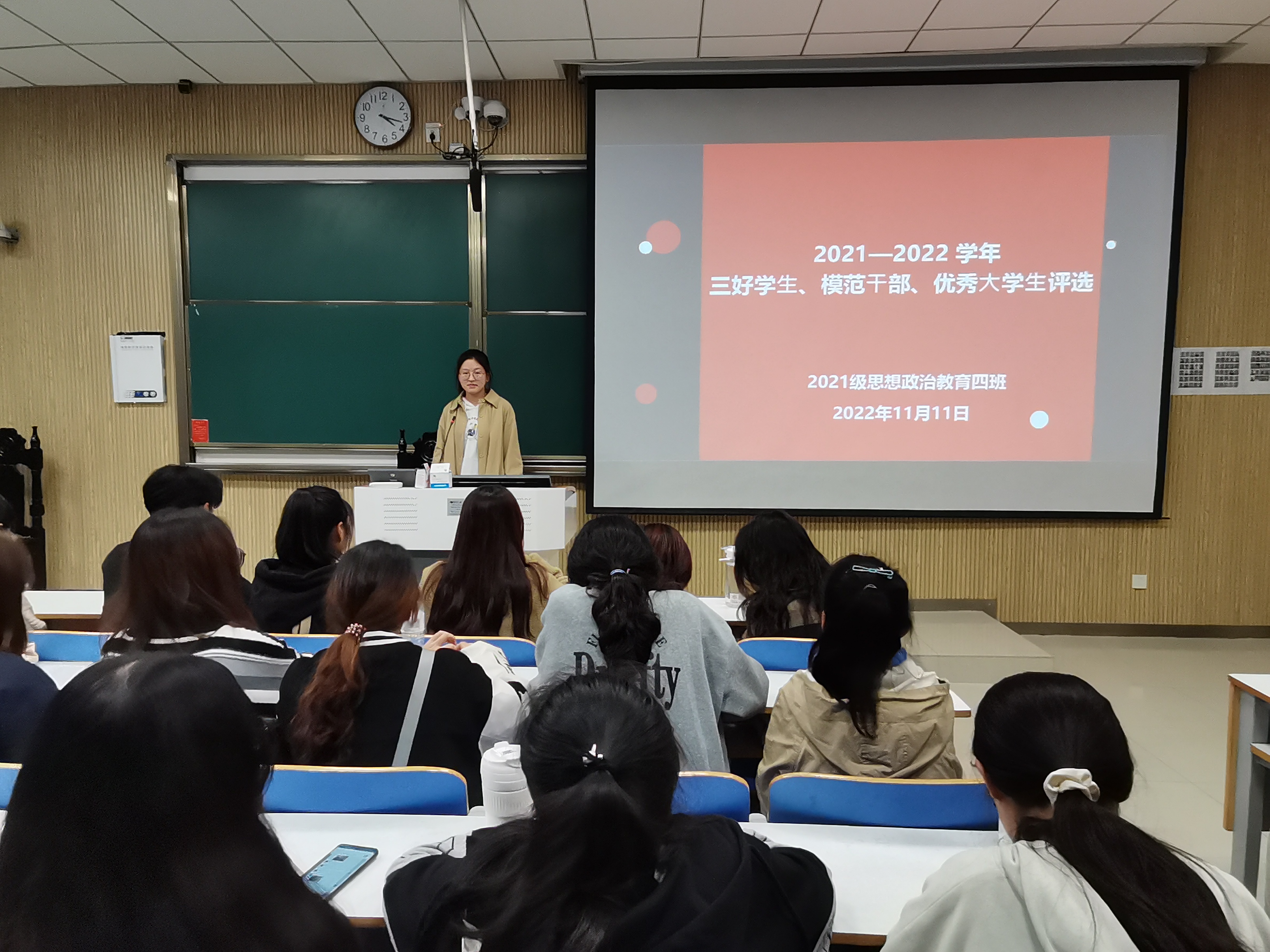 11月11日下午,小说狂人 2021级思想政治教育四班在社科楼515教室开展2021-2022学年“三好学生、模范干部、优秀大学生”评选会。思想政治教育四班全体同学参加本次会议。会议由团支书刘珂含主持。
