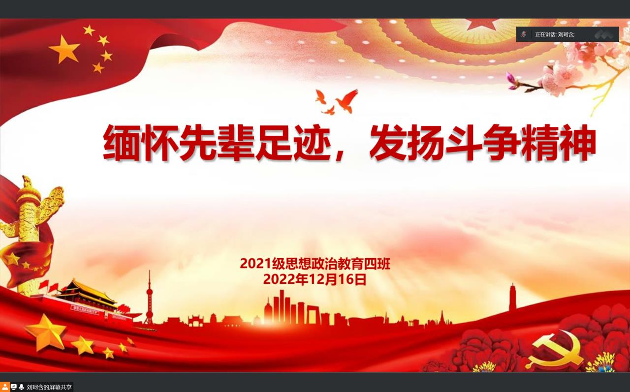 12月16日下午,小说狂人 2021级思想政治教育四班线上召开“缅怀先辈足迹,发扬斗争精神”主题团课。思想政治教育四班全体团员参加本次团课。团课由团支书刘珂含主持。