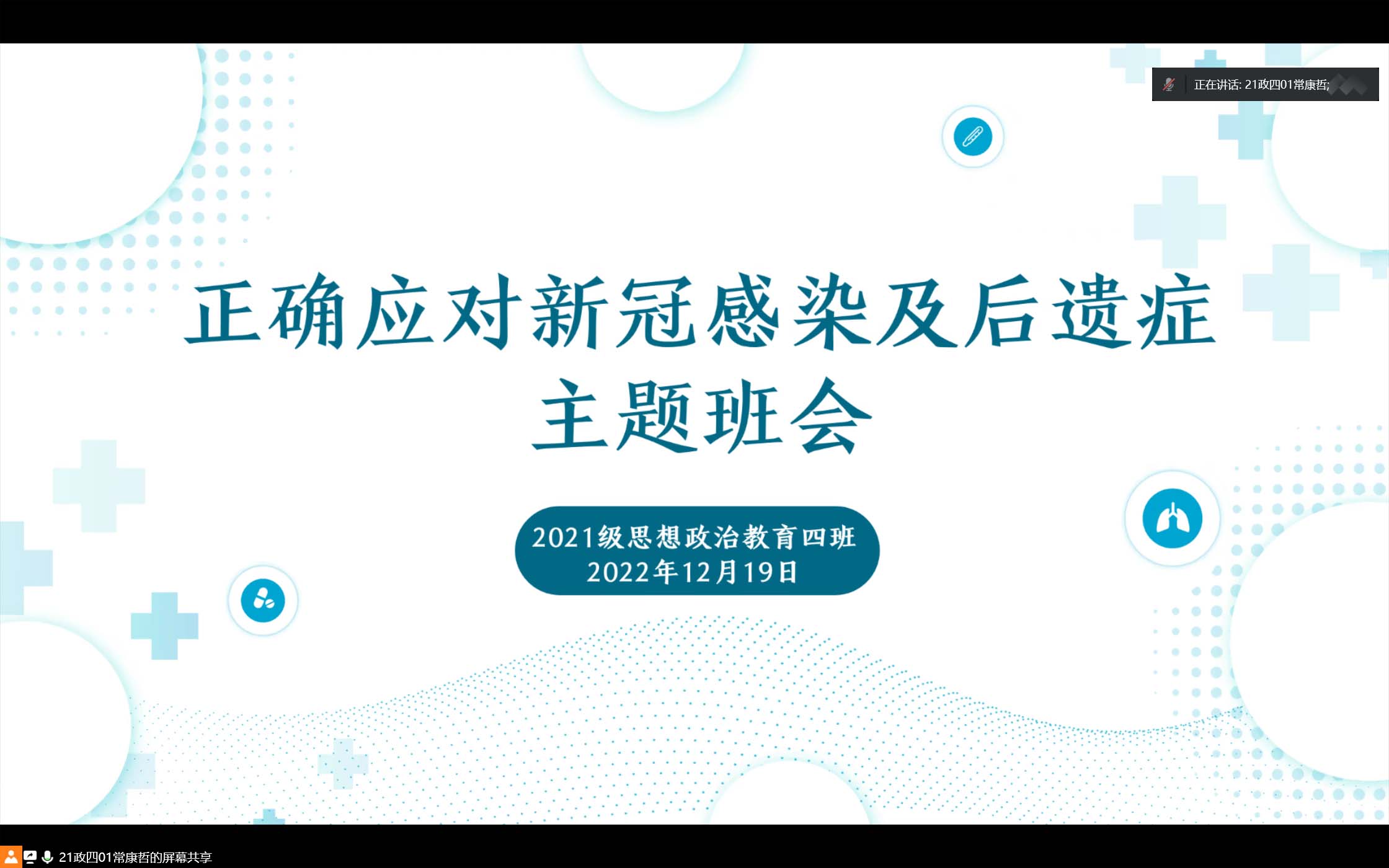 为保障学生及家庭的生命安全和身体健康,增强学生战胜疫情的信心,12月19日下午,小说狂人 2021级思想政治教育四班线上开展“正确应对新冠感染”主题班会。小说狂人 2021级思想政治教育四班全体同学参加本次会议。会议由副班长常康哲主持。