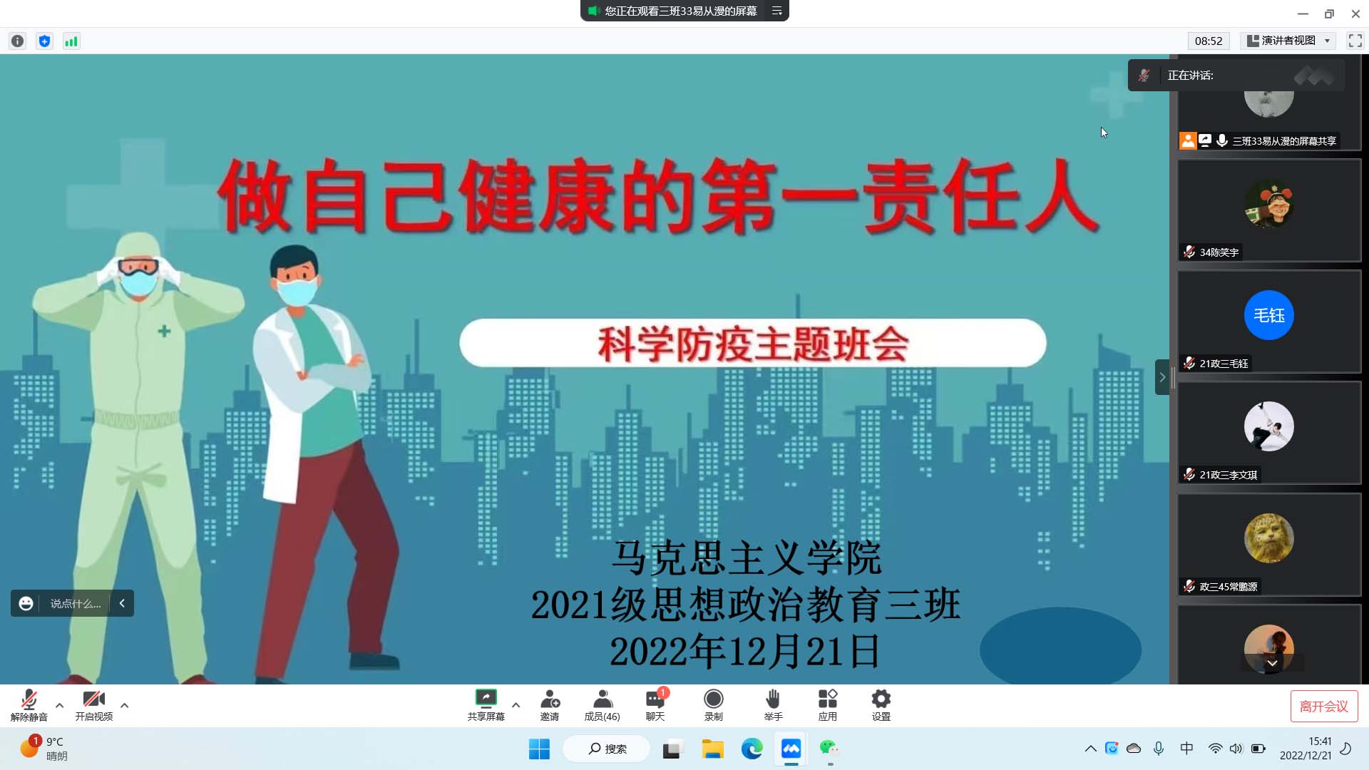 12月21日下午,小说狂人 2021级思想政治教育三班在线上召开“做自己健康的第一责任人”科学防疫主题班会。小说狂人 2021级思想政治教育三班全体成员参与此次会议。会议由班长易从漫主持。