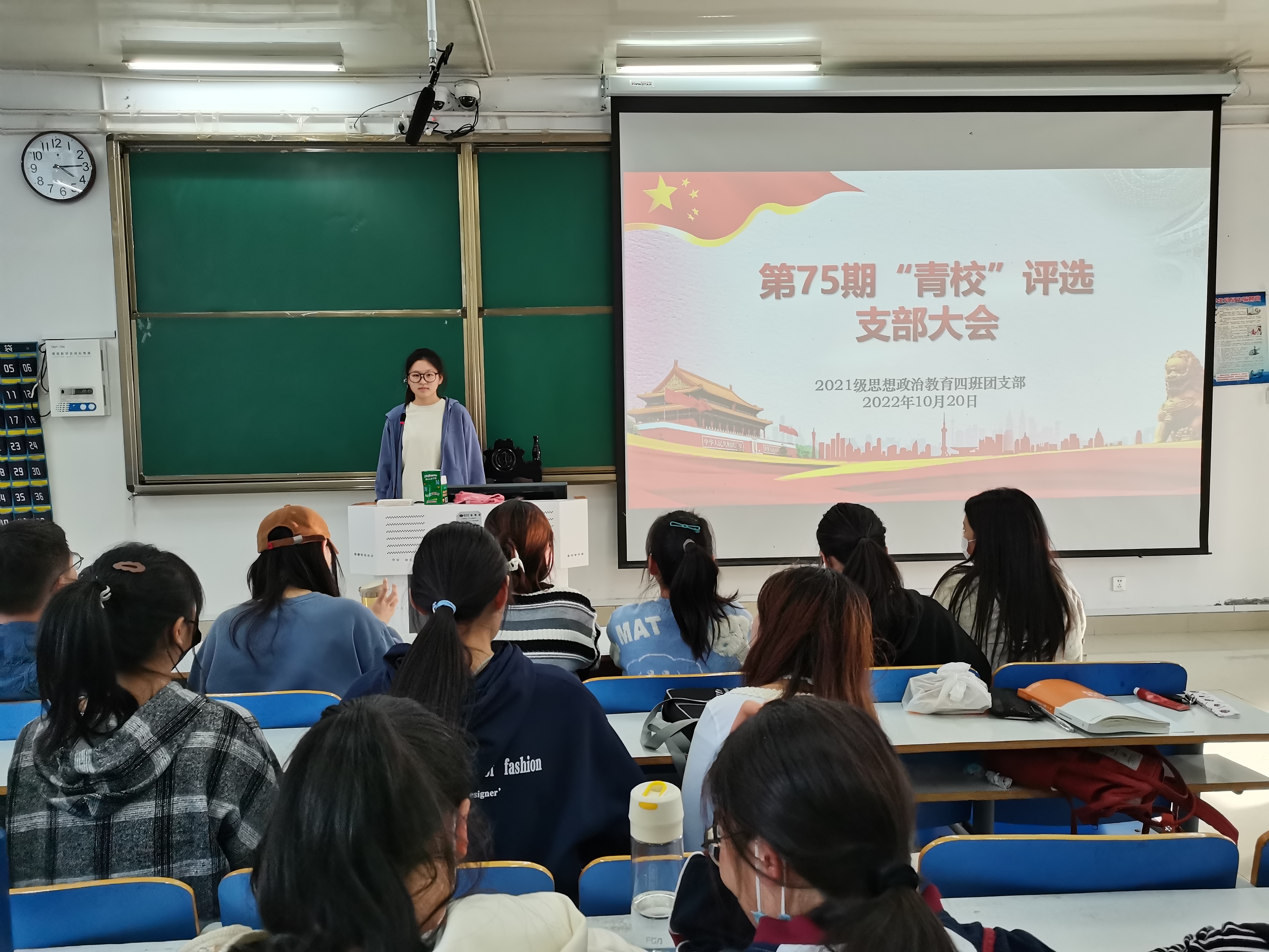 10月20日下午,小说狂人 2021级思想政治教育四班在社科楼515教室开展第75期“青校”评选团支部大会。小说狂人 2021级思想政治教育四班全体团员共同参与本次会议。会议由团支书刘珂含主持。