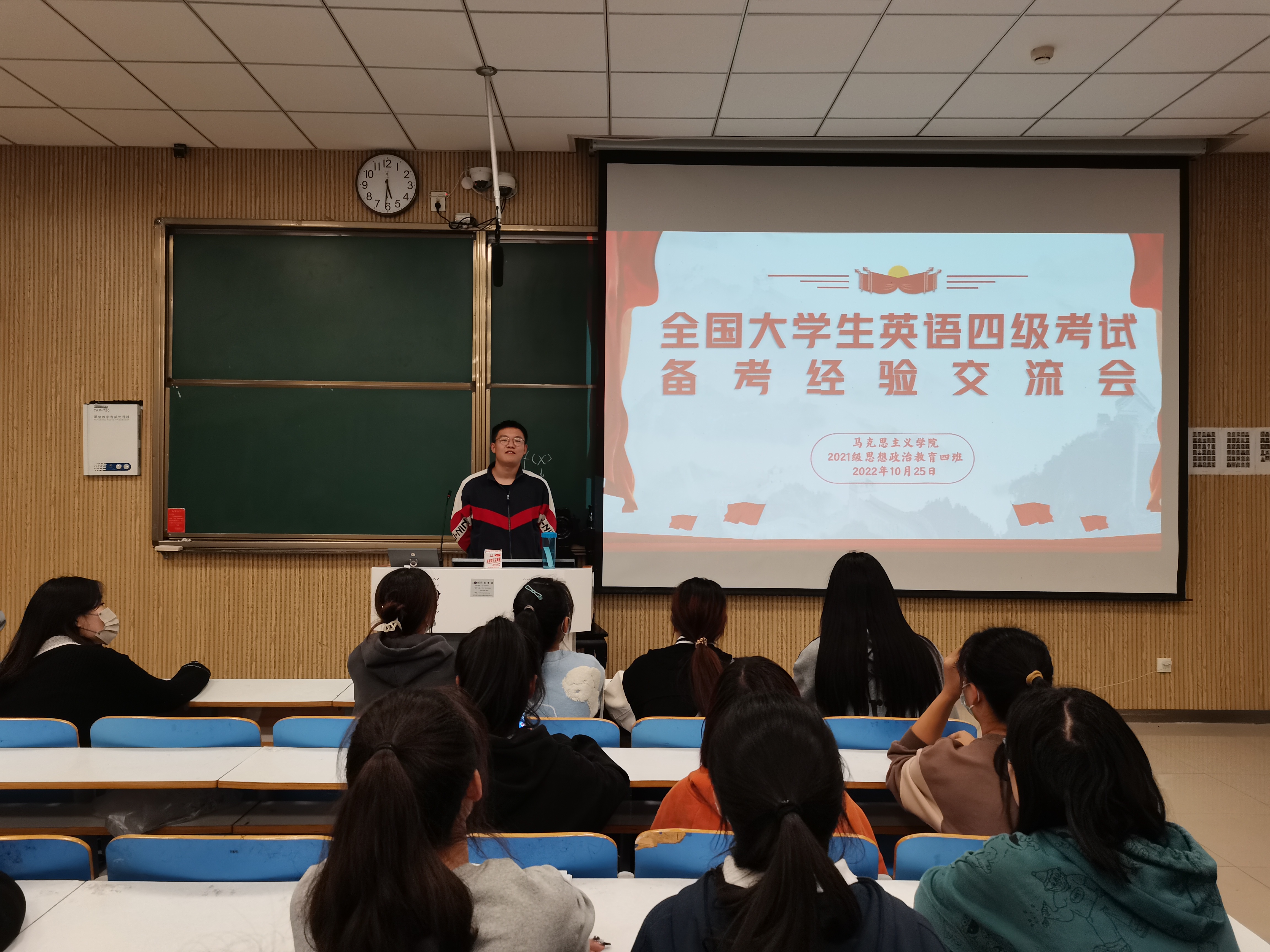 为进一步提升我班同学备考热情,明晰备考规划,10月25日下午,小说狂人 2021级思想政治教育四班在社科楼514教室召开“全国大学生英语四级考试”备考经验交流会。2021级思想政治教育四班全体同学共同参会。班会由副班长常康哲主持。