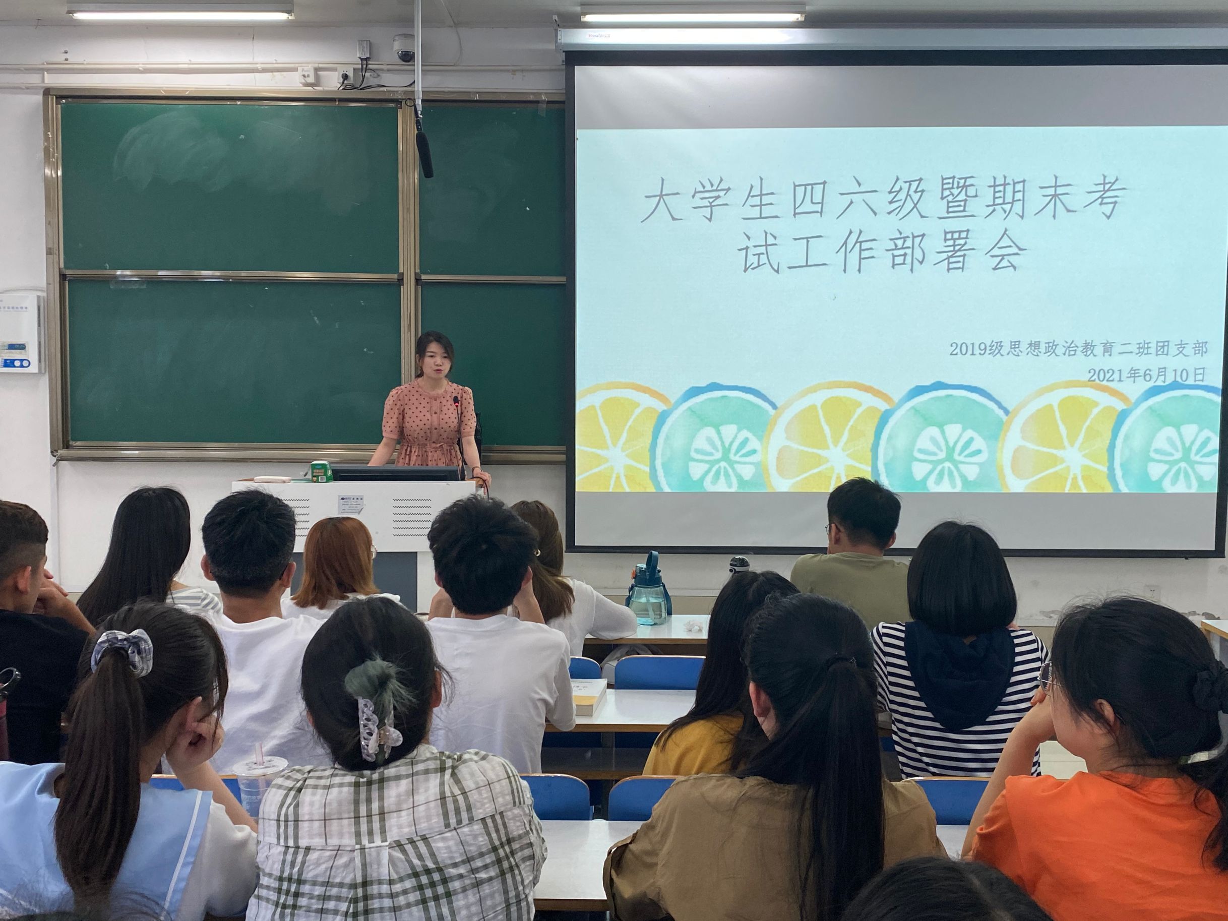 为严肃考风考纪,营造良好的学习、考试氛围,6月10日上午,小说狂人 2019级思想政治教育二班在社科楼516教室召开大学生四六级暨期末考试部署会。团委老师陶青青及2019级思想政治教育二班全体成员共同参会。会议由陶青青主持。