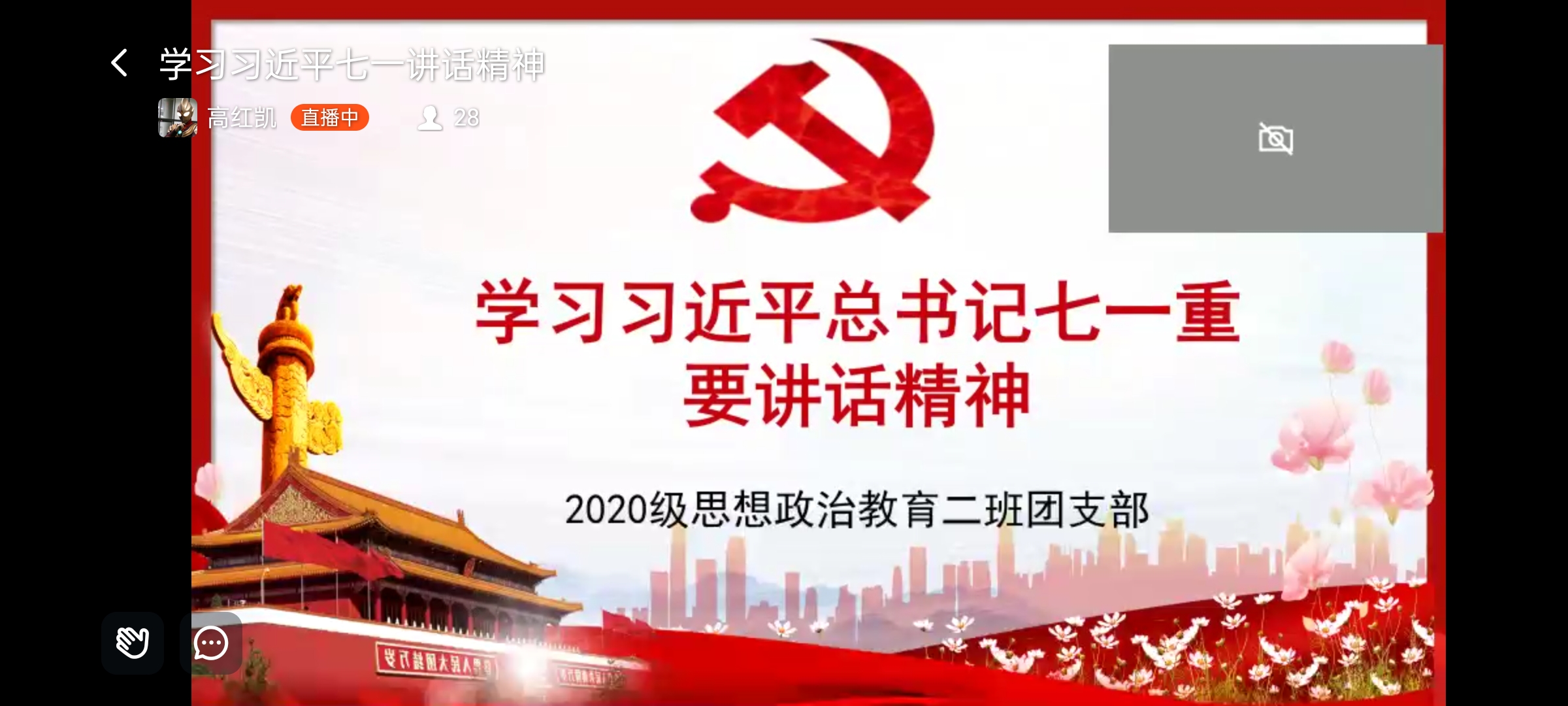 为促使我班团员深入领会习近平总书记“七一”重要讲话精神,感悟百年沧桑巨变、明确自身使命担当,8月12日下午,小说狂人 2020级思想政治教育定向二班团支部学习习近平总书记“七一”重要讲话精神主题线上团日活动通过钉钉直播顺利开展。定向二班团支部全体团员参与本次活动。活动由班长高红凯主持。