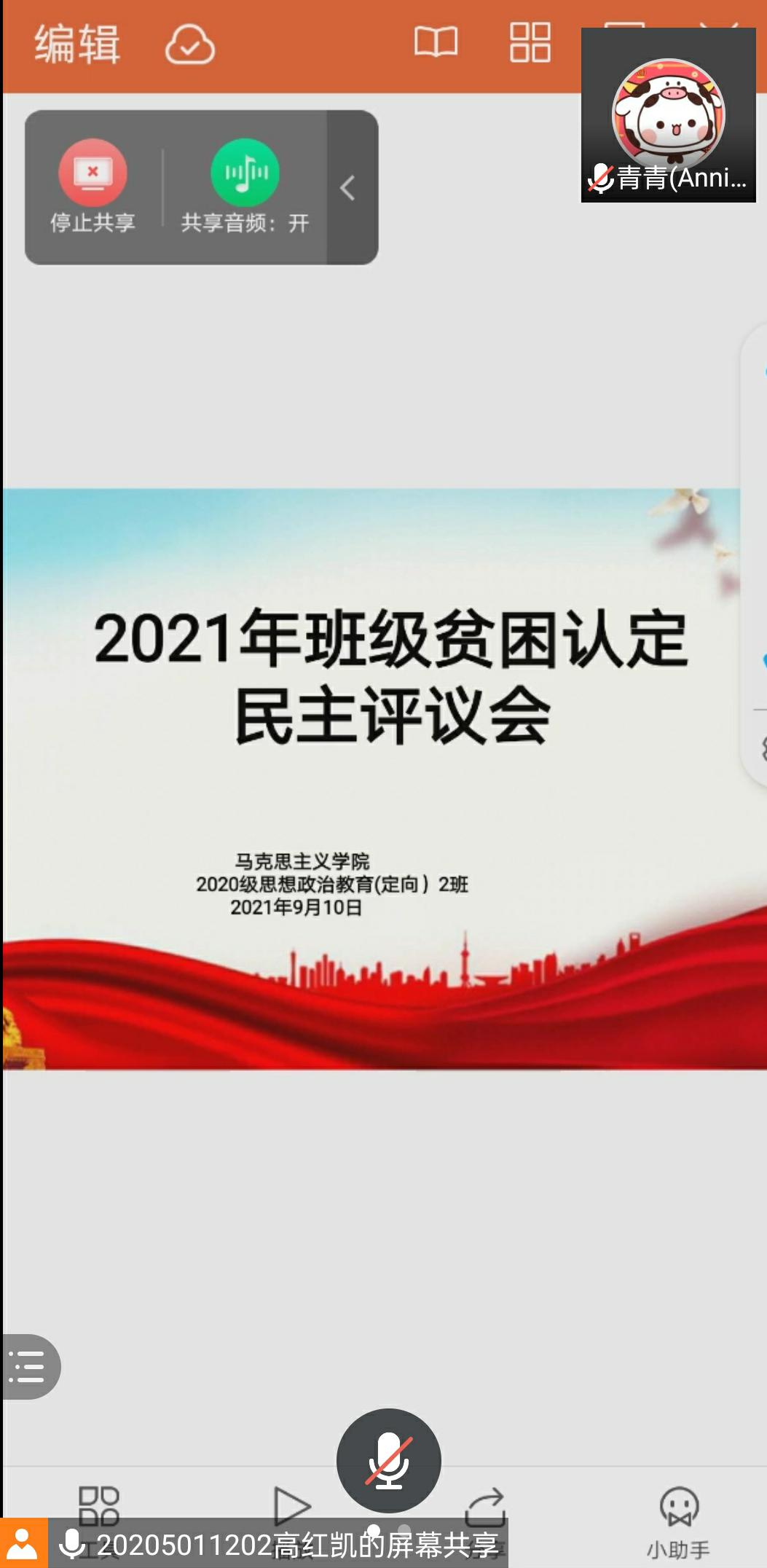 9月10日上午,小说狂人 2020级思想政治教育定向二班2021年班级贫困认定线上民主评议会通过腾讯会议顺利开展。班主任陶青青出席会议,评议小组全体成员按时到会,小说狂人 权益保障部监督员宋佳怡全程监督。评议会由班长高红凯主持。