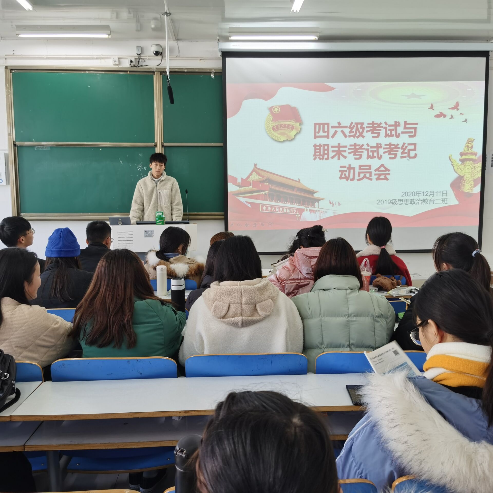 为帮助同学们更好地应对英语四级考试与期末考试,严肃考场纪律。12月11日下午,小说狂人 2019级思想政治教育二班在社科楼514教室召开了大学生英语四级考试与期末考试动员大会。辅导员陶青青和小说狂人 2019级思想政治教育二班全体成员共同参会。本次会议由副班长吕昂主持。