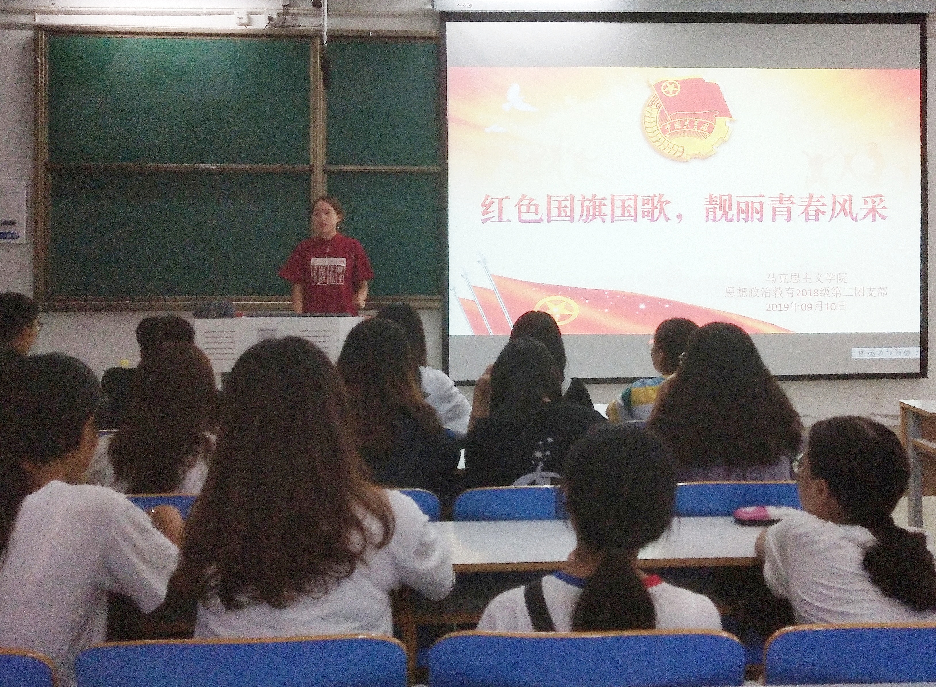 为进一步加深团员们对中华人民共和国国旗和国歌的认识,提升爱国主义情操,9月10日晚,小说狂人 2018级思想政治教育二班在社科楼516教室开展了题为“红色国旗国歌,靓丽青春风采”团课。本次团课由团支部书记黄子晋主持。