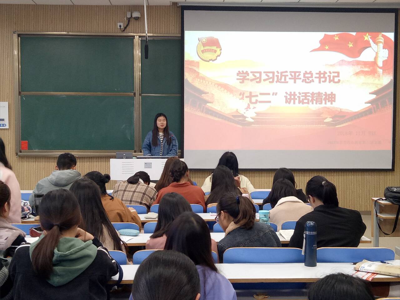 11月8日下午,2017级思想政治教育第二团支部70名团员在社科楼515教室,开展了学习习近平总书记“七二”讲话会议精神团日活动,活动由组织委员王泽鑫主持。