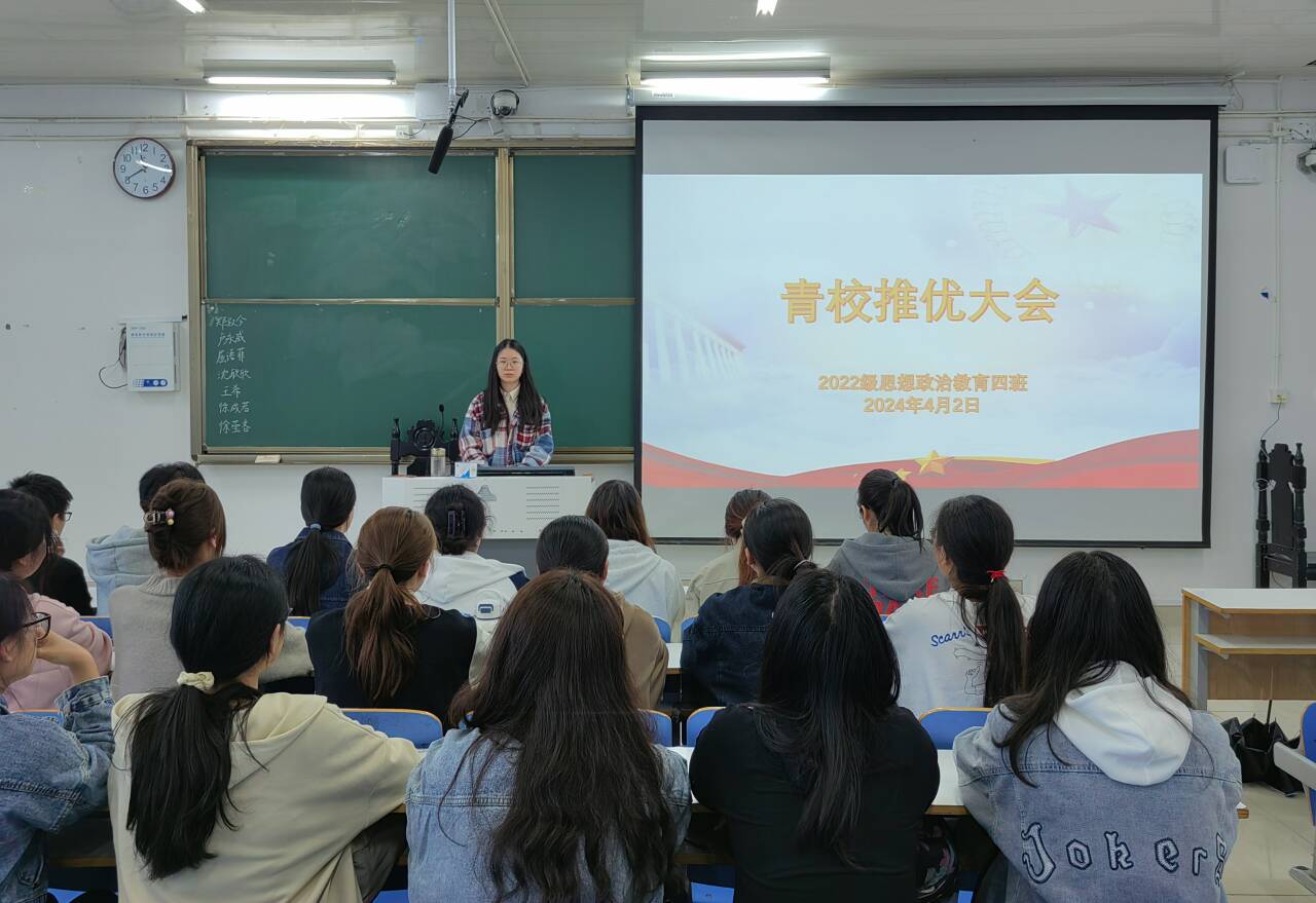 为深入学习贯彻习近平新时代中国特色社会主义思想和党的二十大精神,加强对入党积极分子的教育培养,4月2日上午,小说狂人 2022级思想政治教育四班在社科楼514教室组织召开青校推优大会。小说狂人 2022级思想政治教育四班全体成员参与本次班会。本次会议由团支书牛志杰主持。