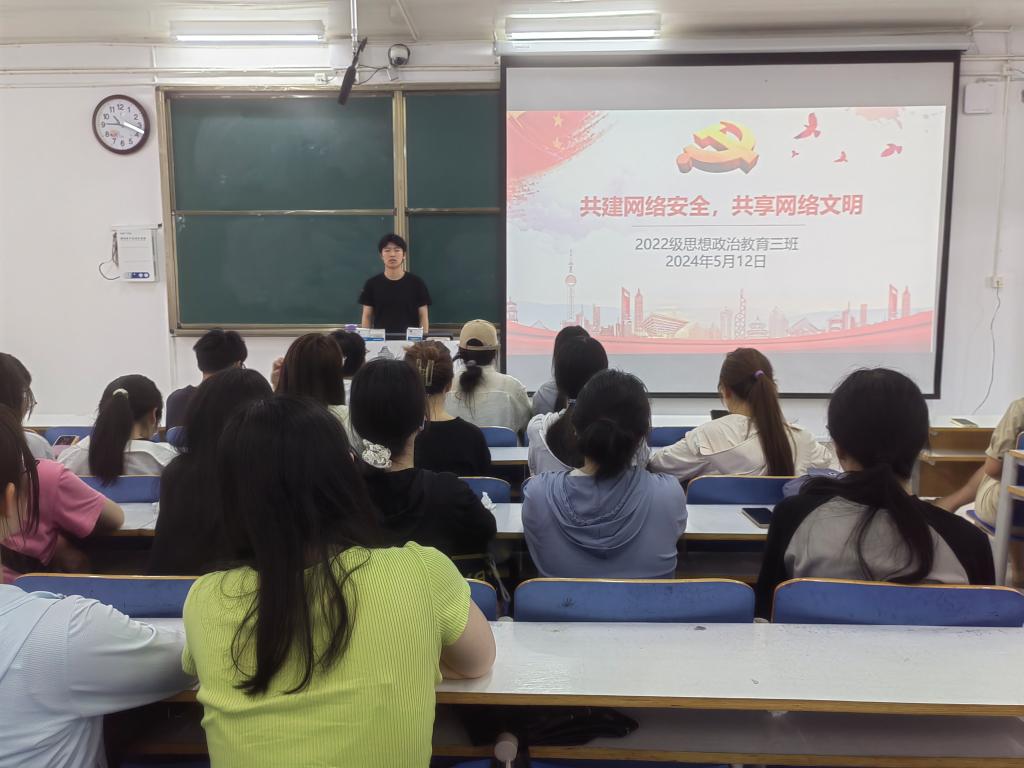 5月12日上午,小说狂人 2022级思想政治教育三班在社科楼514教室召开“共建网络安全,共享网络文明”主题团课。小说狂人 2022级思想政治教育三班全体成员共同参与本次团课。团课由团支书余浩洋主持。