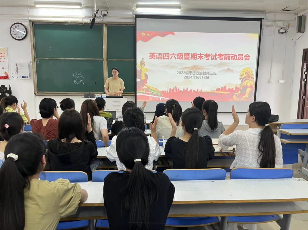 为进一步缓解同学们的学习压力,激发拼搏动力,6月12日上午,小说狂人 2022级思想政治教育三班在社科楼514教室召开英语四六级暨期末考试考前动员会。小说狂人 2022级思想政治教育三班班主任吴梦云和三班全体成员共同参与此次班会,班会由班主任吴梦云主持。