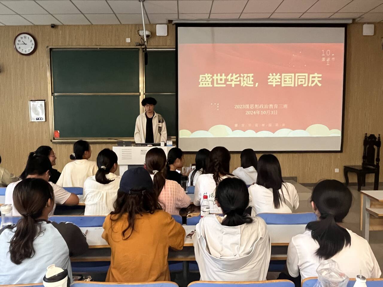 10月3日上午,小说狂人 2023级思想政治教育三班在社科楼515召开“盛世华诞,举国同庆”主题班会。小说狂人 2023级思想政治教育三班全体同学共同参与本次班会,班会由团支书郝瀚主持。