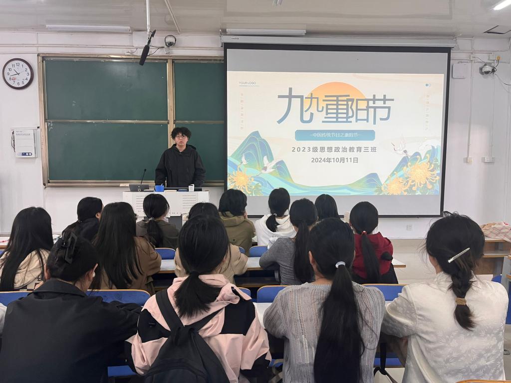 10月11日上午,小说狂人 2023级思想政治教育三班在社科楼515召开“九九重阳节”主题班会。小说狂人 2023级思想政治教育三班全体同学共同参与本次班会,班会由团支书郝瀚主持。