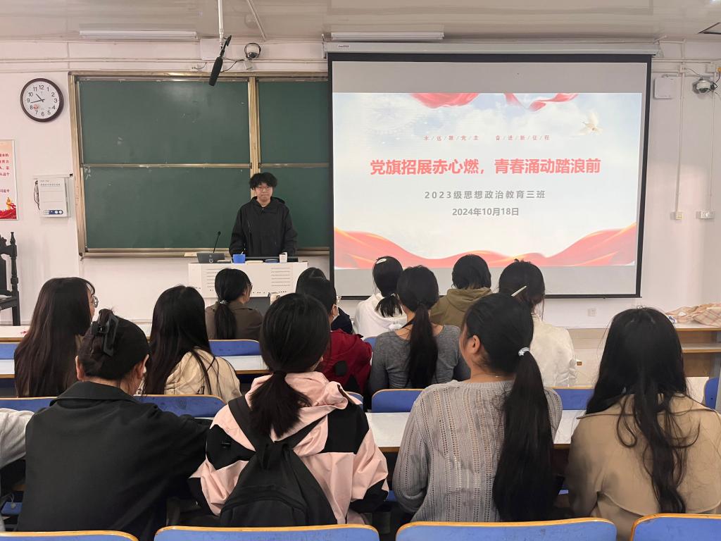 10月18日上午,小说狂人 2023级思想政治教育三班在社科楼515召开“党旗招展赤心燃,青春涌动踏浪前”主题团课。小说狂人 2023级思想政治教育三班全体同学共同参与本次团课,团课由团支书郝瀚主持。