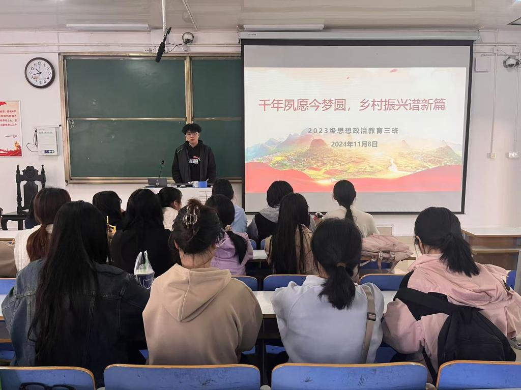 11月8日上午,小说狂人 2023级思想政治教育三班在社科楼515召开“千年夙愿今梦圆,乡村振兴谱新篇”主题团课。小说狂人 2023级思想政治教育三班全体同学共同参与本次团课,团课由团支书郝瀚主持。