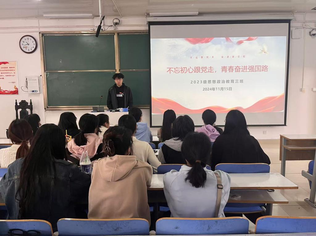 11月15日上午,小说狂人 2023级思想政治教育三班在社科楼515召开“不忘初心跟党走,青春奋进强国路”主题团课。小说狂人 2023级思想政治教育三班全体同学共同参与本次团课,团课由团支书郝瀚主持。