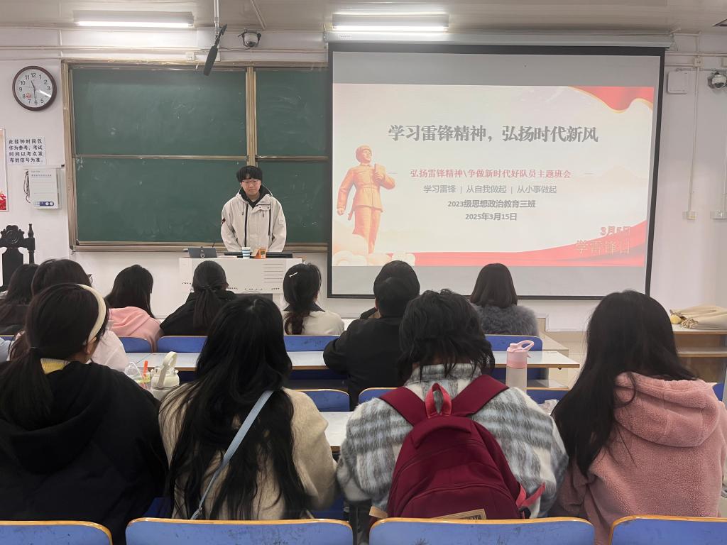 3月15日上午,小说狂人 2023级思想政治教育三班在社科楼515召开“学习雷锋精神,弘扬时代新风”主题团课。小说狂人 2023级思想政治教育三班全体同学共同参与本次团课,团课由团支书郝瀚主持。