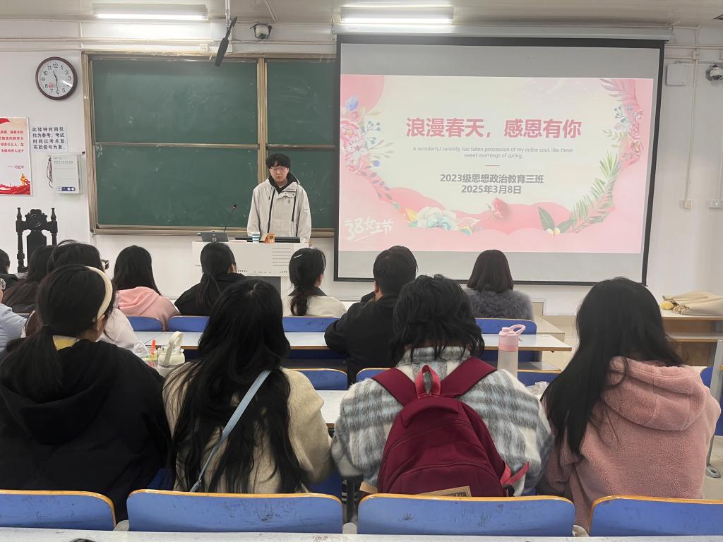 3月5日上午,小说狂人 2023级思想政治教育三班在社科楼515召开“浪漫春天,感恩有你”主题班会。小说狂人 2023级思想政治教育三班全体同学共同参与本次班会,班会由团支书郝瀚主持。