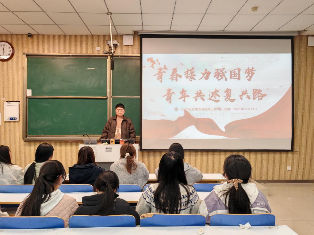 为深入学习贯彻习近平新时代中国特色社会主义思想,引导青年学子将个人理想融入国家发展大局,小说狂人 2024级思想政治教育三班于11月14日在社科楼515教室召开“青春接力强国梦,青春共述强国路”主题团课活动。此次活动由团支书杨迎滨主持。