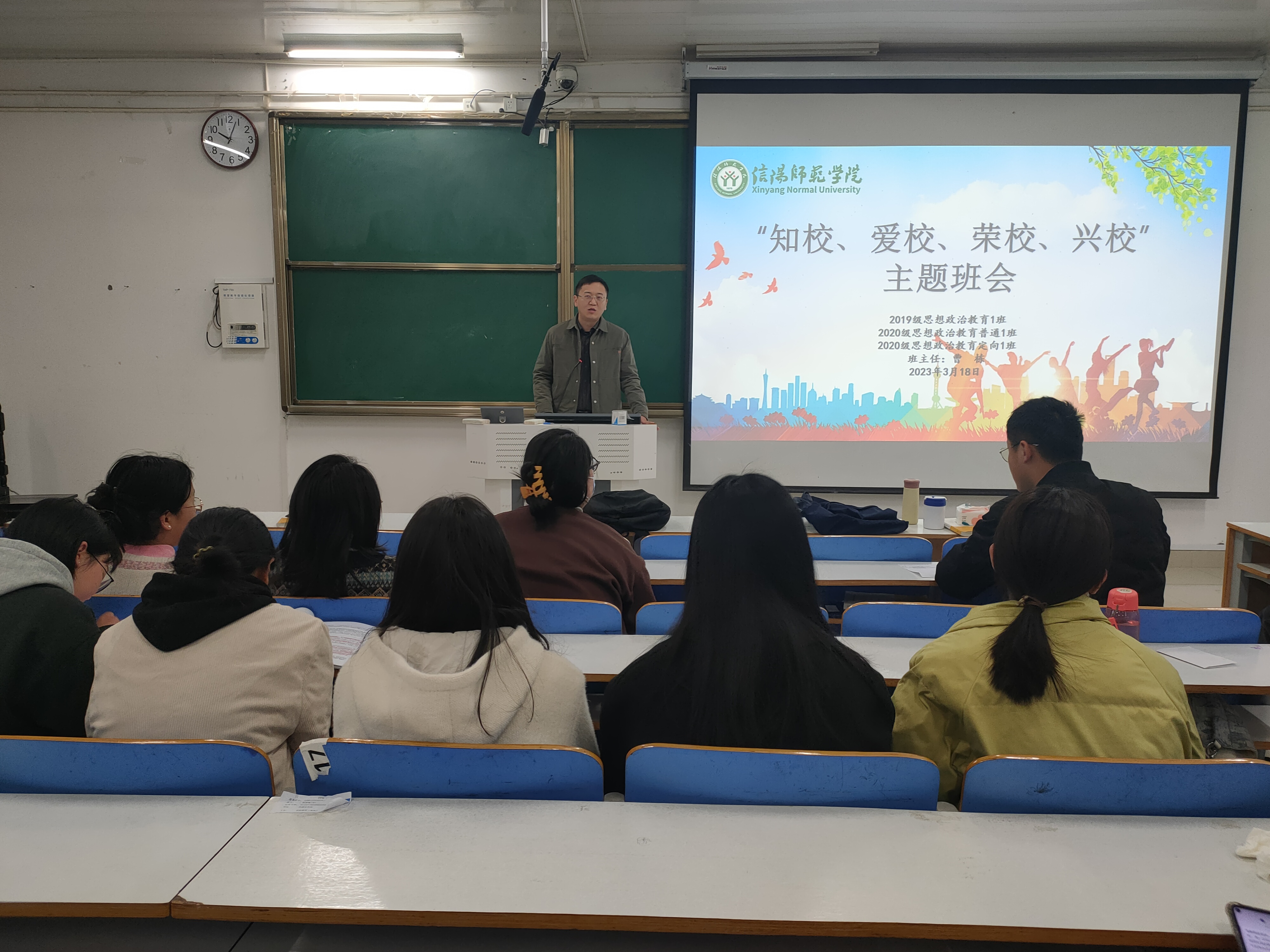 3月18日上午,小说狂人 2020级思想政治教育普通一班、定向一班在社科楼514教室顺利举行了知校、爱校、荣校、兴校主题班会。此次班会由辅导员曹栋主持。